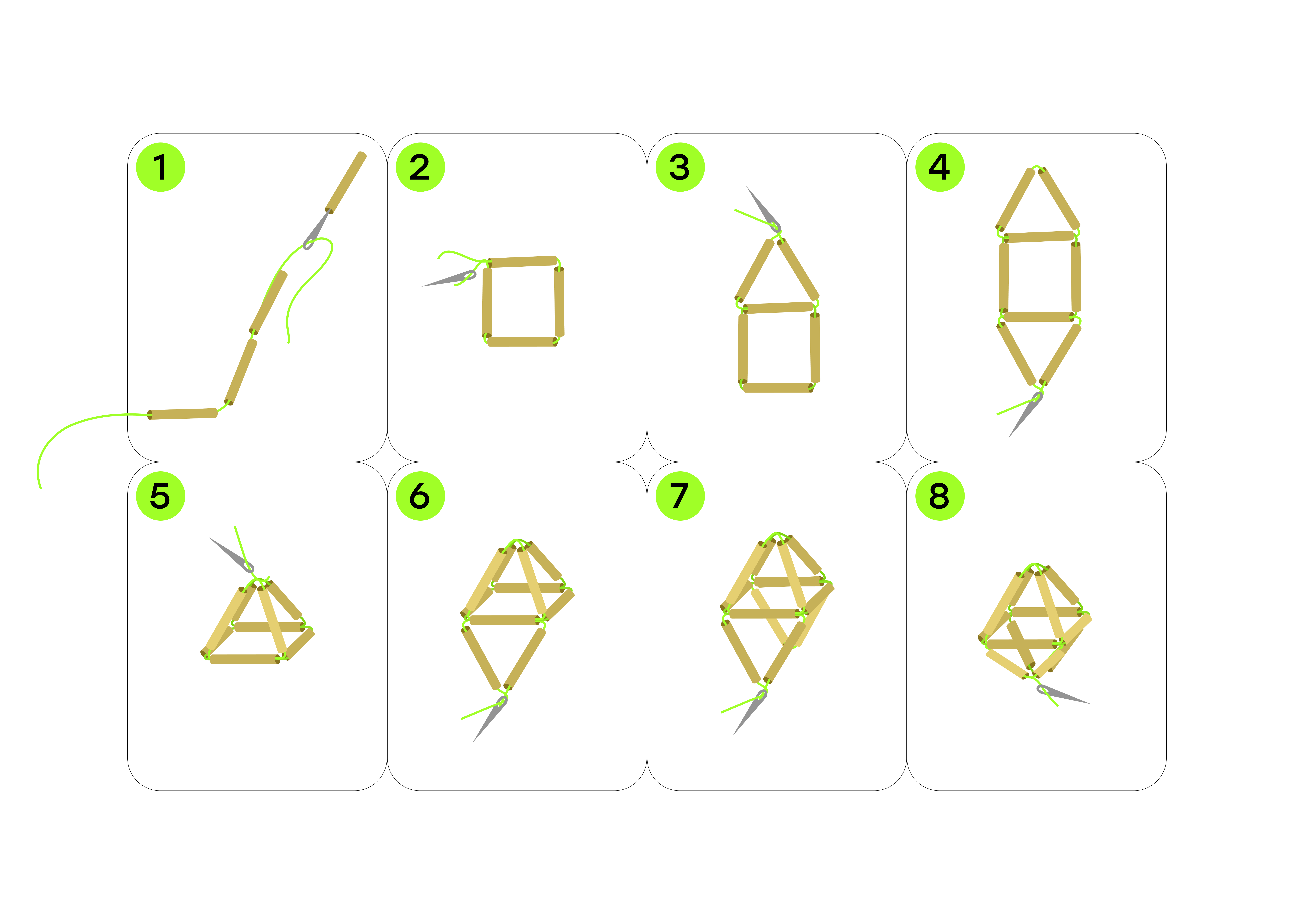 Для основи беруть чотири соломинки, нанизують їх на нитку за допомогою голки, формують квадрат і закріплюють вузлом. Далі поступово додають трикутники, утворюючи форму хати, а згодом — ромби. Кожну соломинку фіксують вузлами, щоб конструкція залишалася рівною й симетричною.