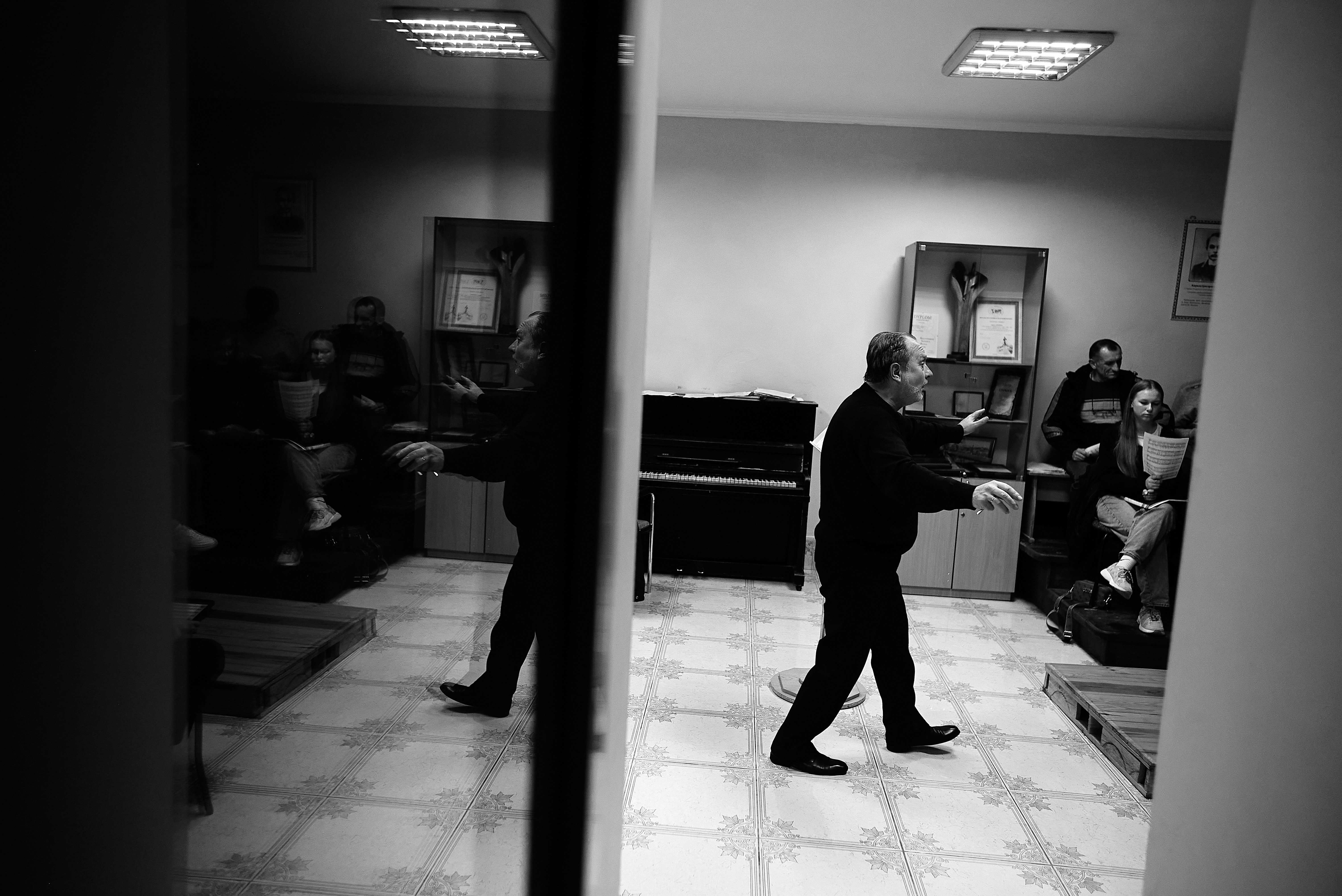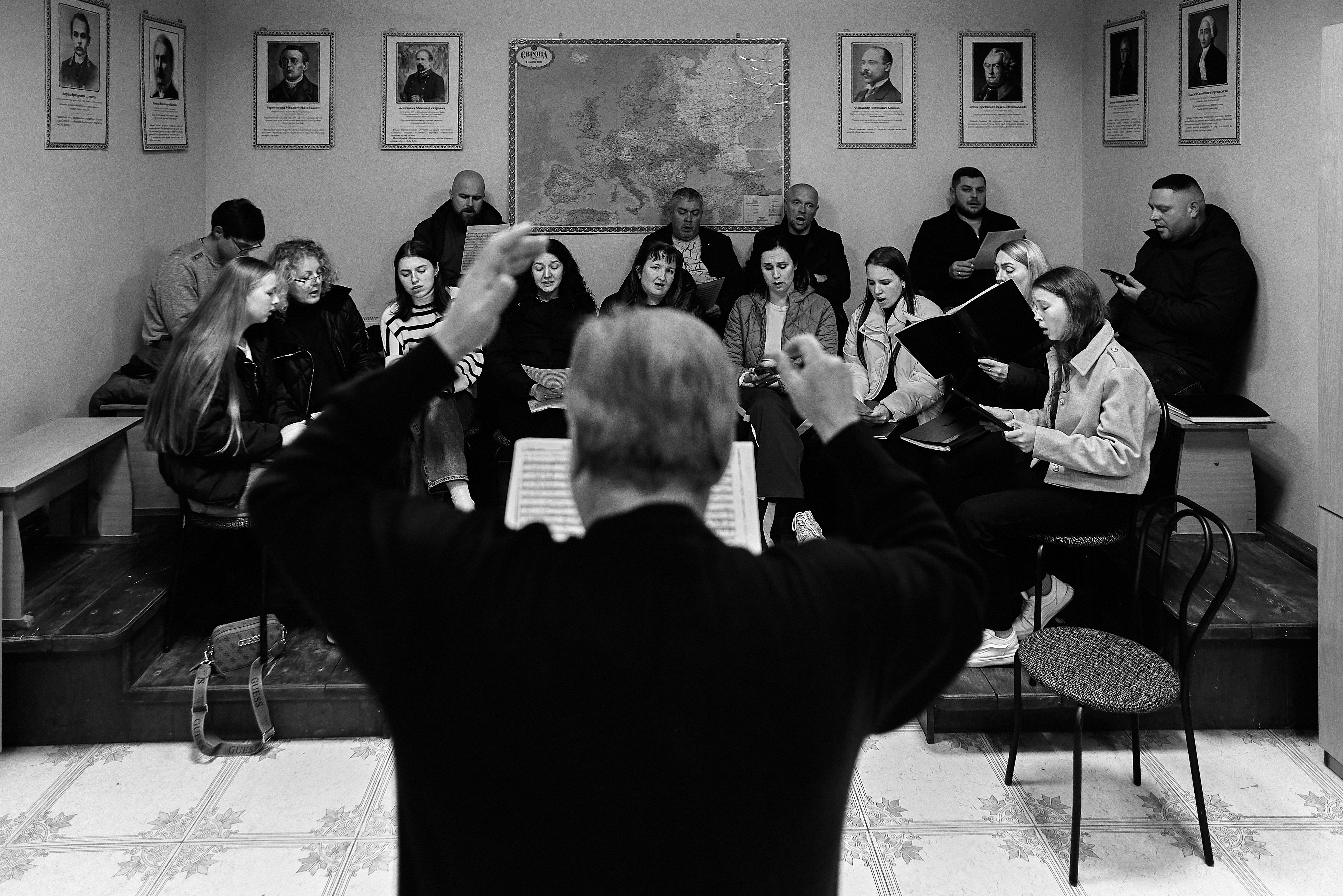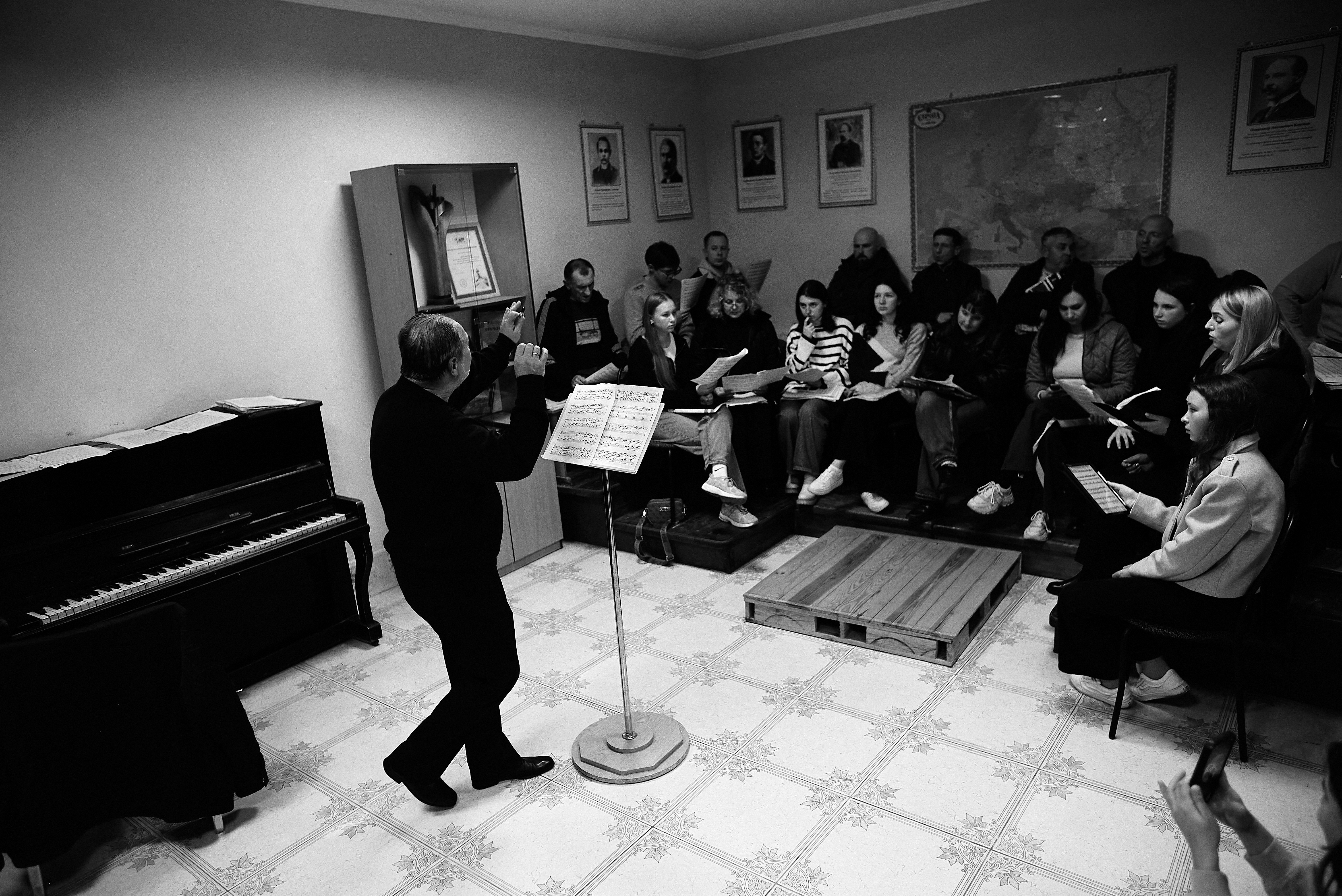 Контрасти репетицій: експресія диригента на тлі статичного хору.