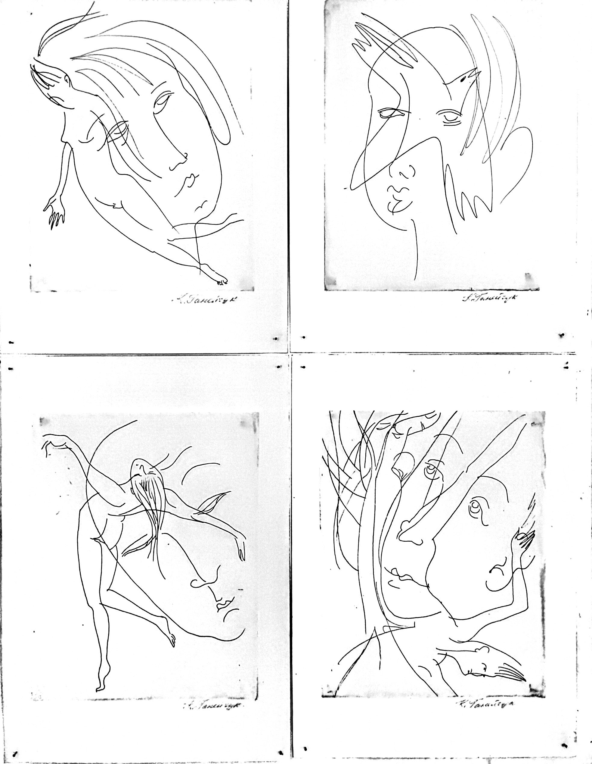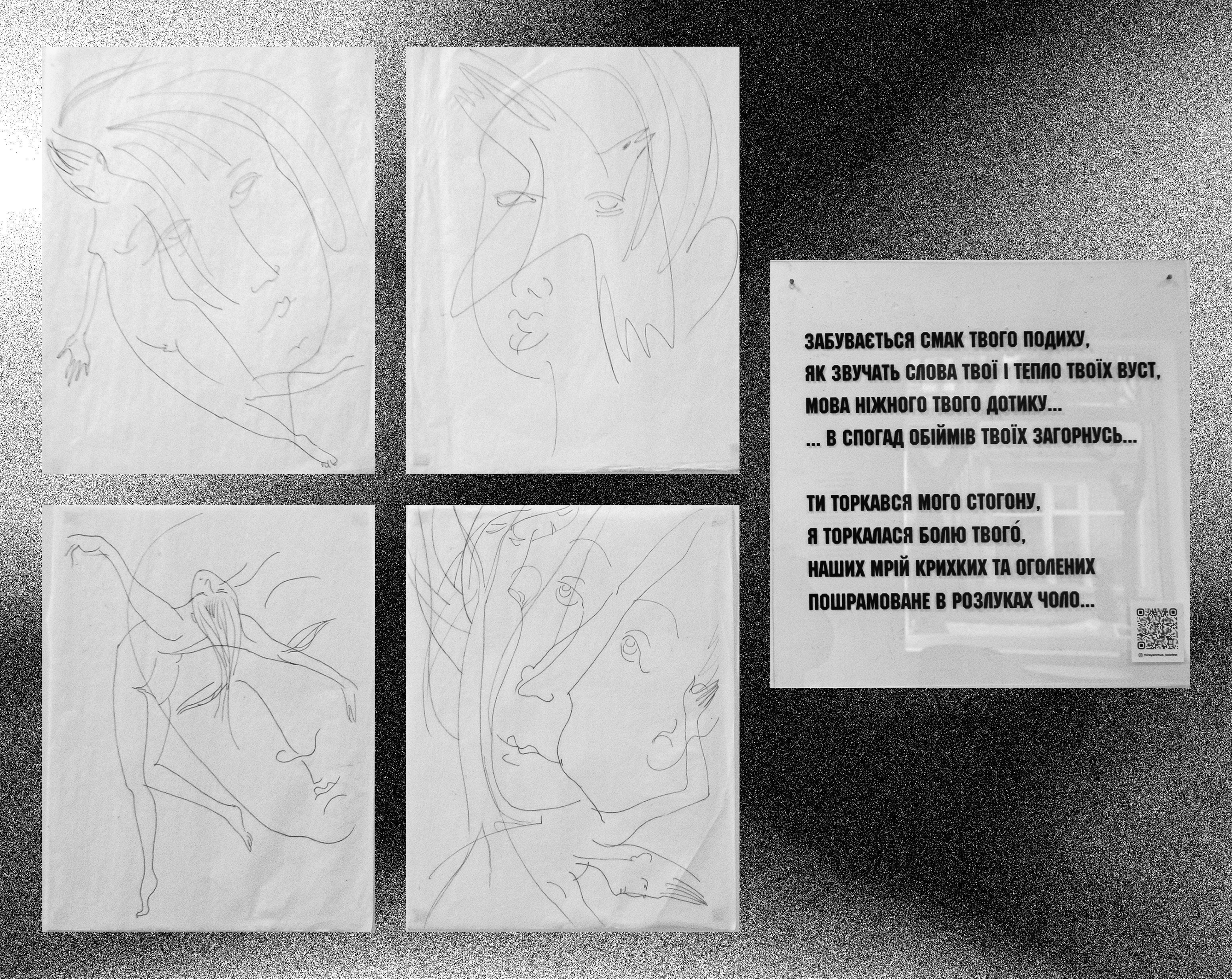 На чотирьох аркушах — майже аскетичний малюнок. Художниця хоч і не зображує війну прямо, але створює відчуття крихкості. Ледь помітний штрих формує обличчя й тіла, що перетікають одне в одне, розчиняються та зростаються. Обличчя розщеплюються, профіль і анфас співіснують в одному просторі, жіночі постаті ніби проростають з інших тіл.