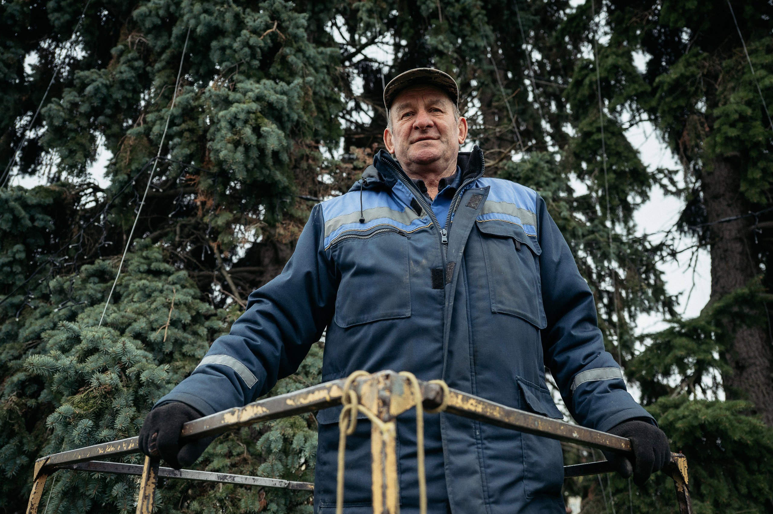 Оздоблювати починають з трьох ялин на Театральному майдані. Іванович перелічує новорічний декор різних років, загинаючи пальці: синьо-жовті вогники й кулі, лише сині прикраси, паперові гірлянди. Колір 2026 року — жовтий. Чоловік не рефлексує про тренди — аби іграшки й вогники трималися добре.