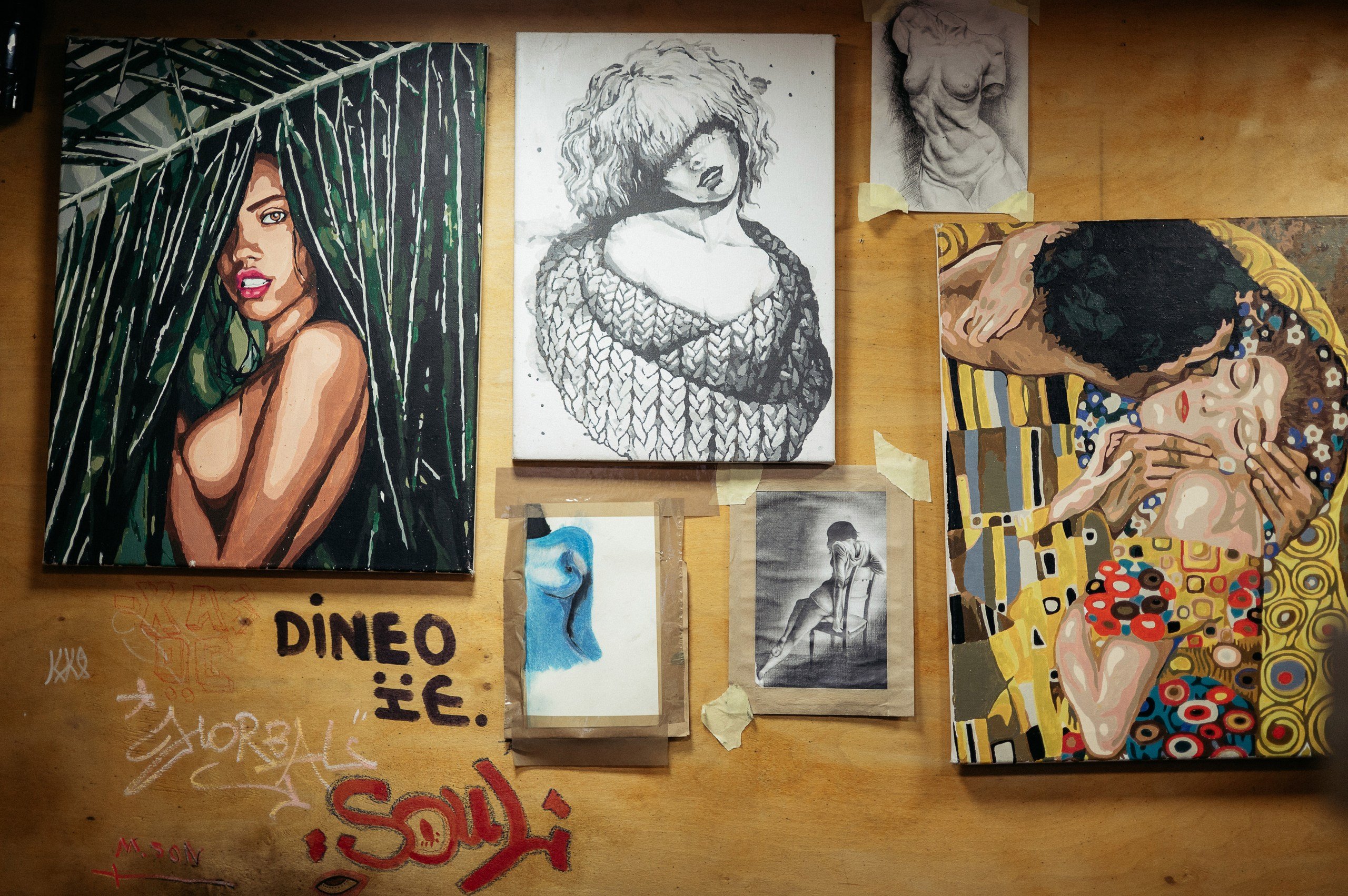 Всередині — тісно, але затишно. Велика кавоварка в кутку стільниці повільно налаштовується на робочий день: трохи гарчить та відкашлюється стовпом пари в холодний зимовий ранок. На верхній платформі для підігріву чашок — стос паперових стаканчиків та кілька порцелянових горнят. На полиці поряд рівним рядочком стоять сиропи, кориця, какао, цукор. На стіні позаду баристи — мінігалерея: репродукція «Поцілунку» Ґустава Клімта та кілька малюнків оголених жіночих фігур.