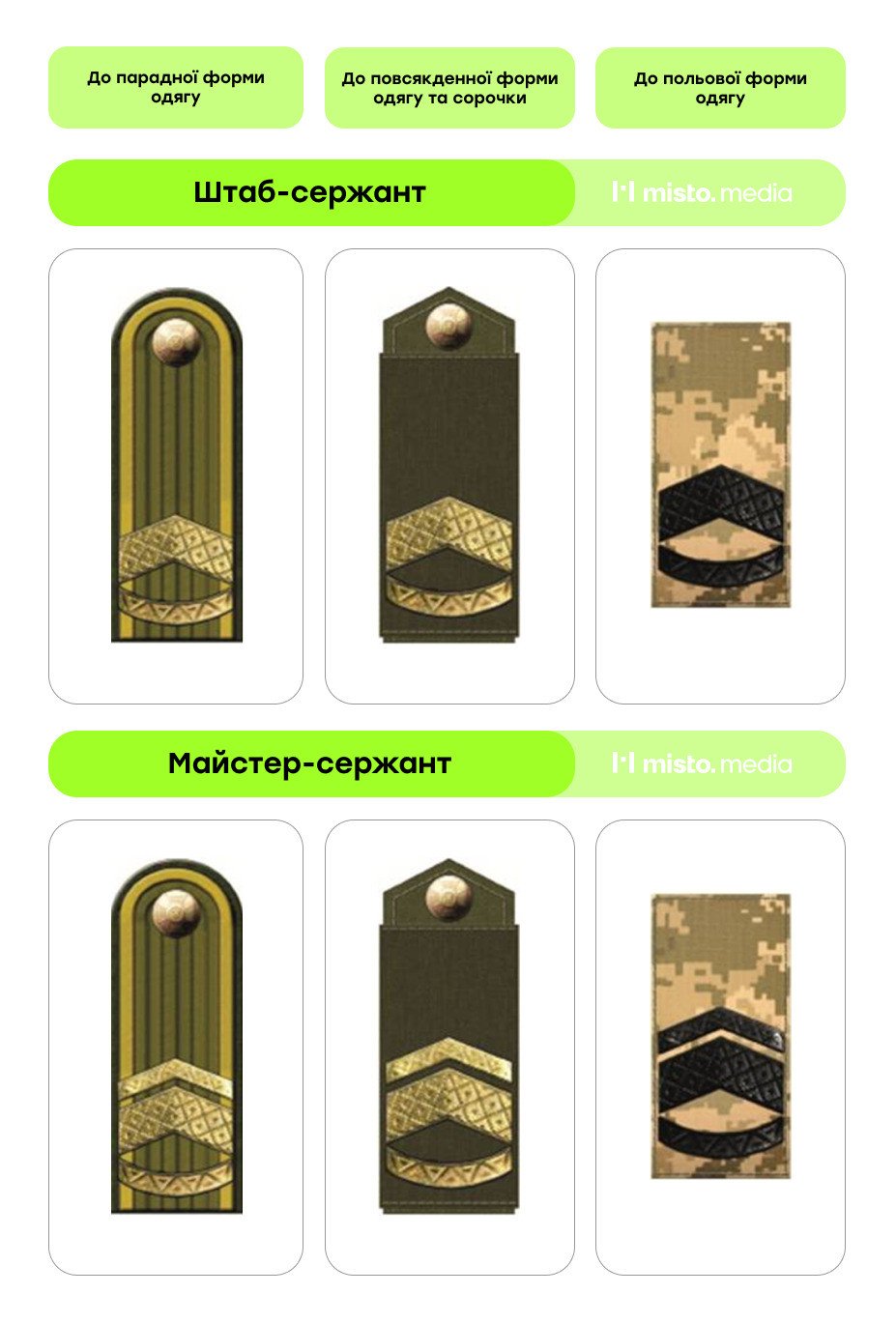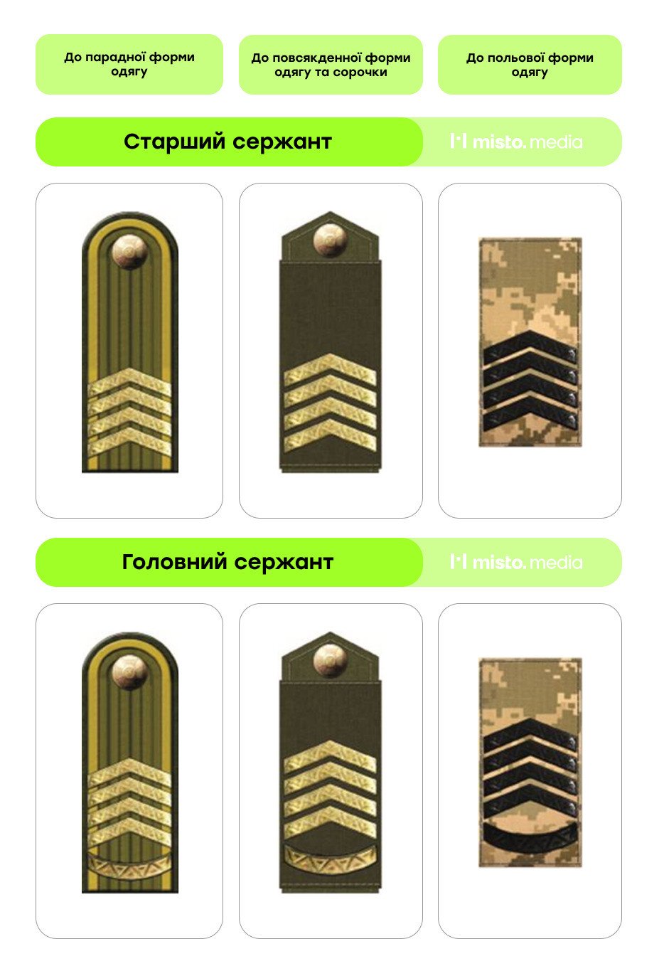 сержантський склад. Сержанти — лідери на місцях, керують солдатами. Їх називають хребтом армії, бо вони є містком між офіцерами, які планують завдання, та солдатами, які їх виконують;