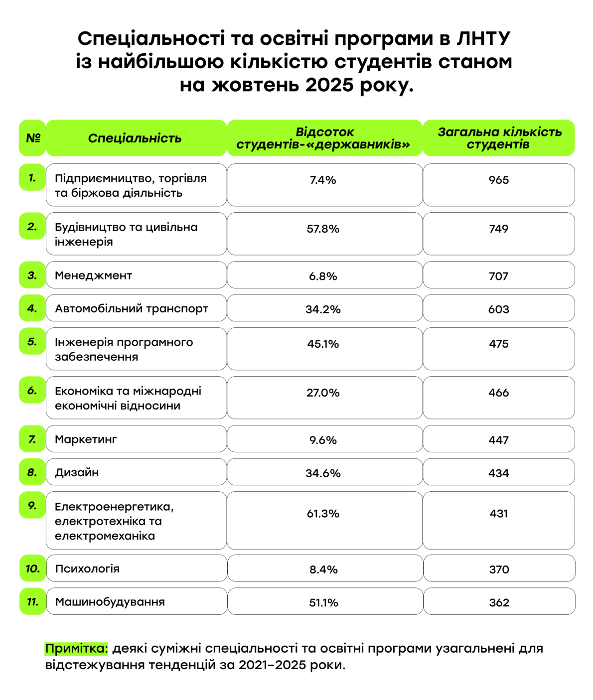 Частина спеціальностей, які стимулює держава, мають популярність в абітурієнтів. Наприклад, в ЛНТУ другим за кількістю студентів є фах «Будівництво та цивільна інженерія». Також до десятки найпоширеніших входять «Автомобільний транспорт» та «Інженерія програмного забезпечення».
