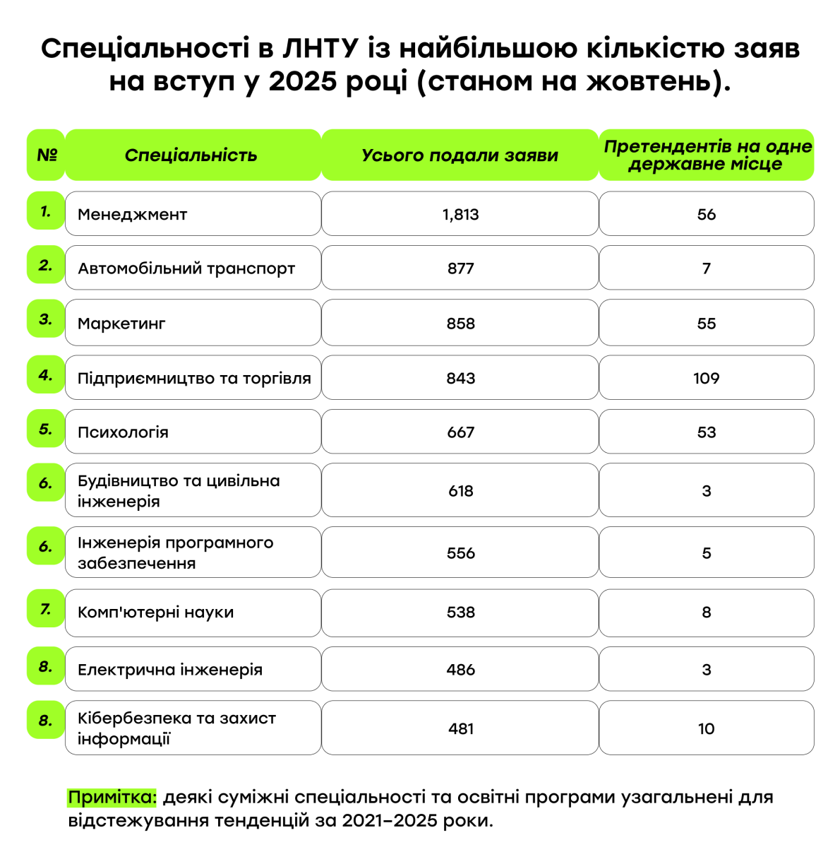 А ще на цих спеціальностях була досить мала конкуренція під час вступної кампанії 2025 року. Наприклад, за одне державне місце на «Математиці», «Фізиці та астрономії», «Хімії» у ВНУ конкурували менш як три людини. Для порівняння, на «Менеджменті» — понад 50.