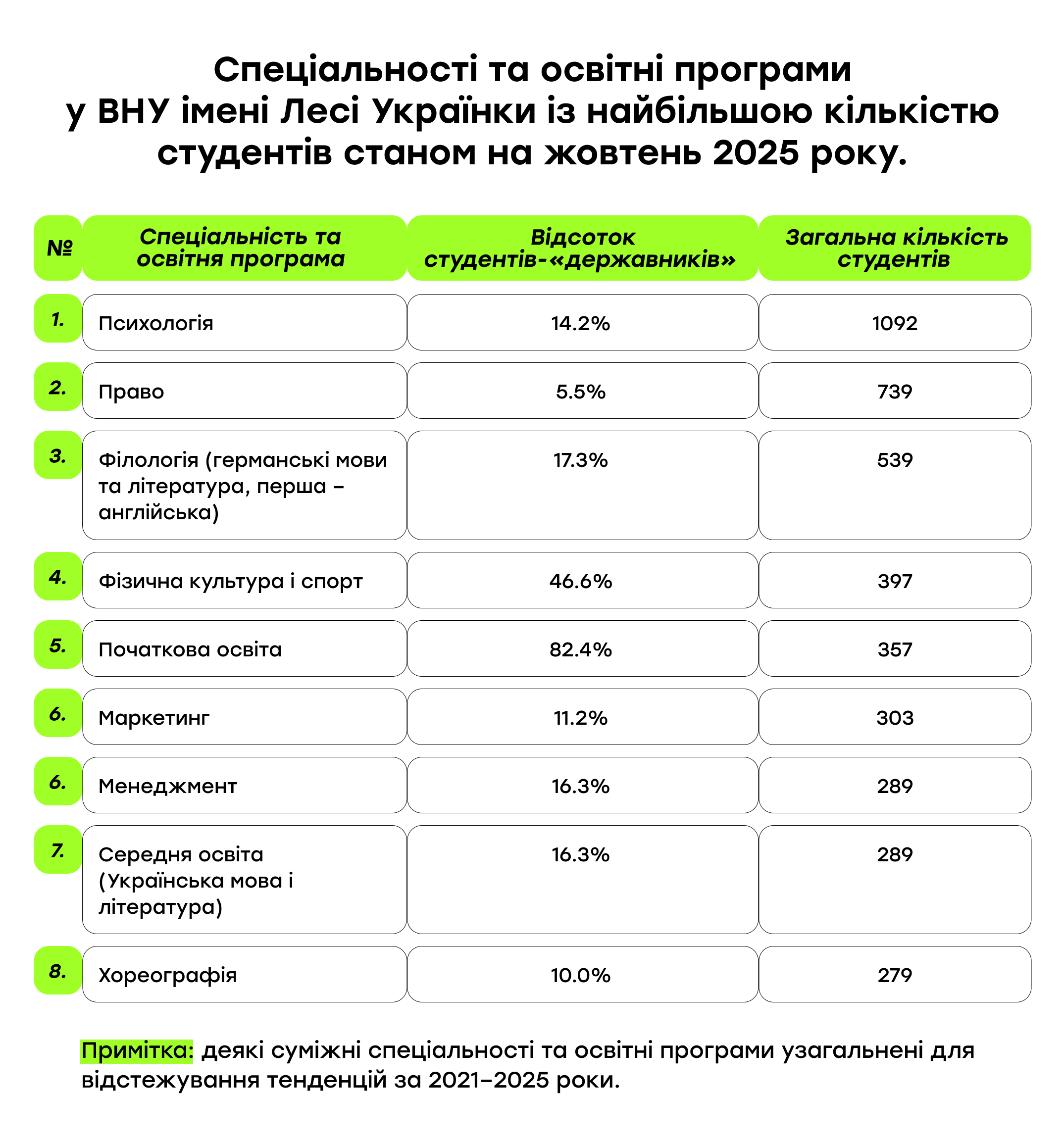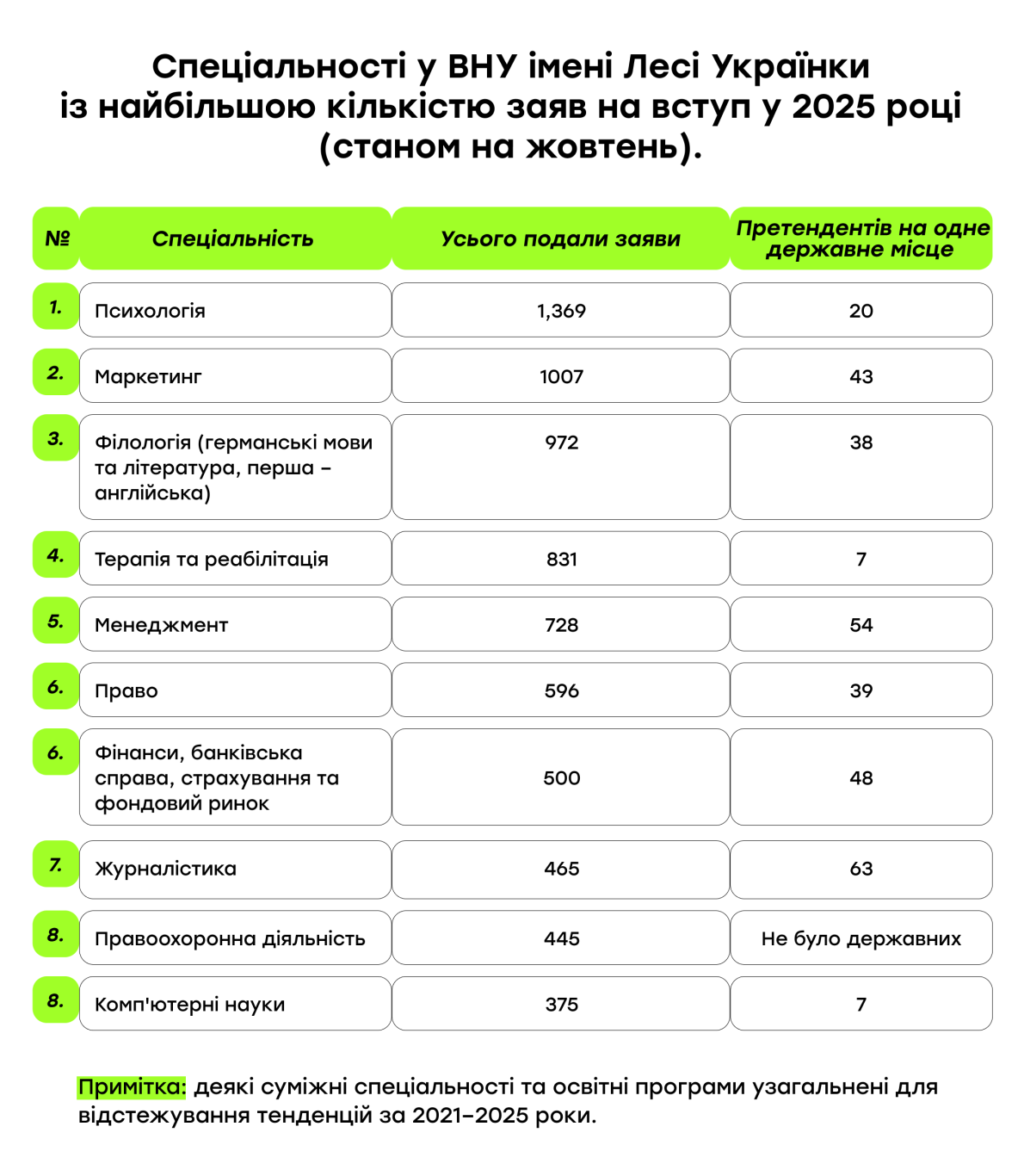 Водночас реальна кількість студентів, які навчаються на трендових спеціальностях, не зовсім відповідає кількості наявних вакансій. Наприклад, у ВНУ на магістратурі за спеціальністю «Психологія» станом на 2025 рік навчаються близько 460 студентів. Це означає, що більшість із них отримають дипломи впродовж 1–2 років.