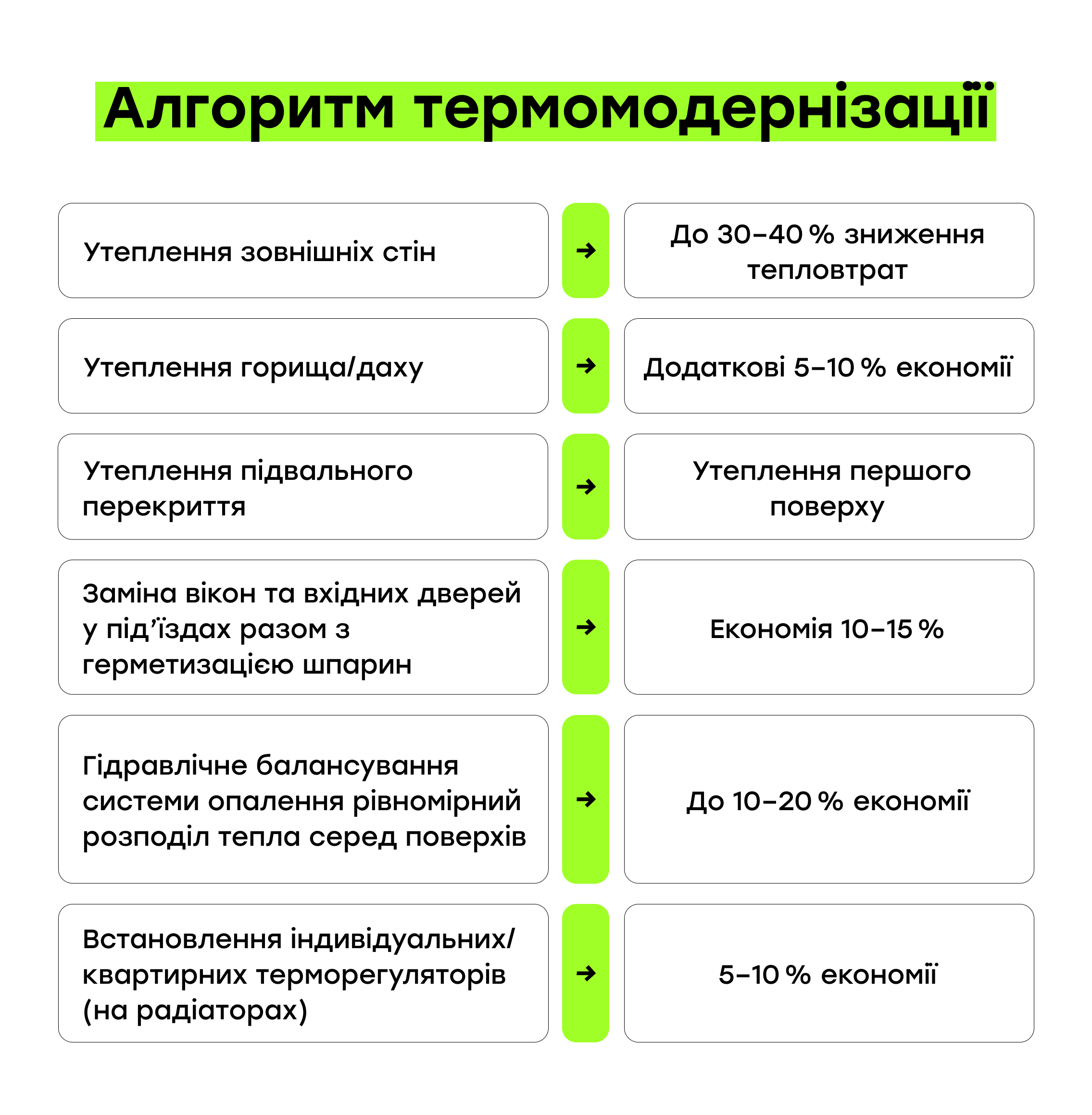 встановлення індивідуальних / квартирних терморегуляторів (на радіаторах) — ще 5–10% економії.