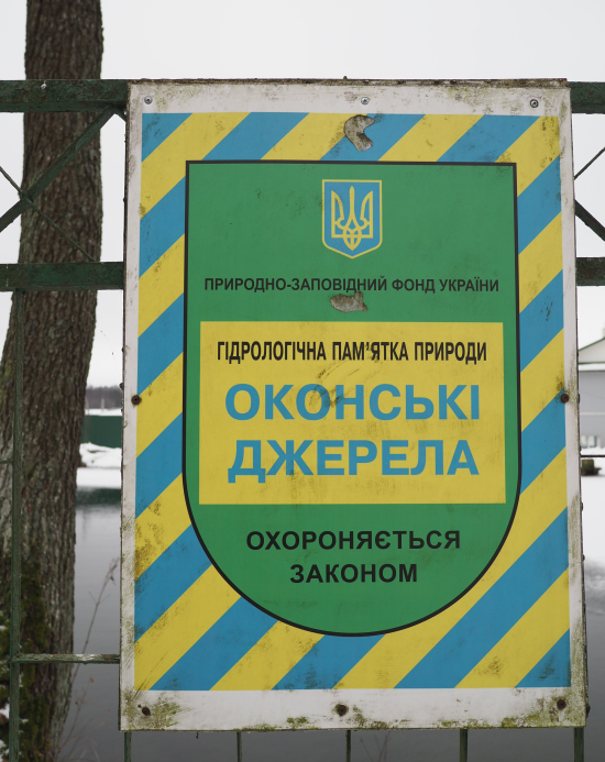 На початку лютого ми переконалися на власні очі, що пульсації джерела на поверхні ставка немає. Хоча через водне плесо можна побачити труби, з яких зазвичай струменіла вода. Йдеться про джерела поруч із трасою та кафе «Криничка». Тут же ж поруч рибне господарство та табличка — Оконські джерела, памʼятка природи.
