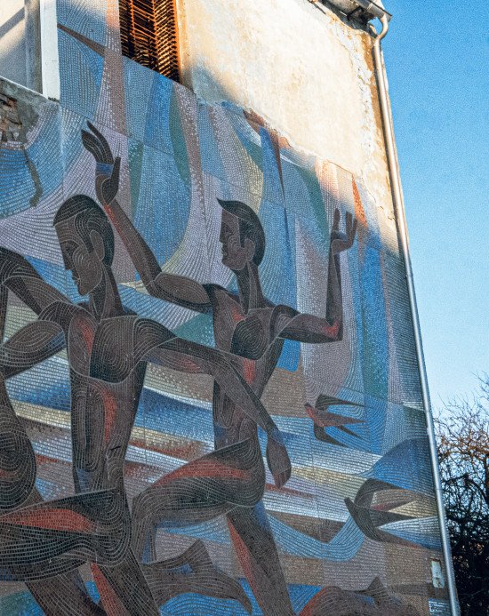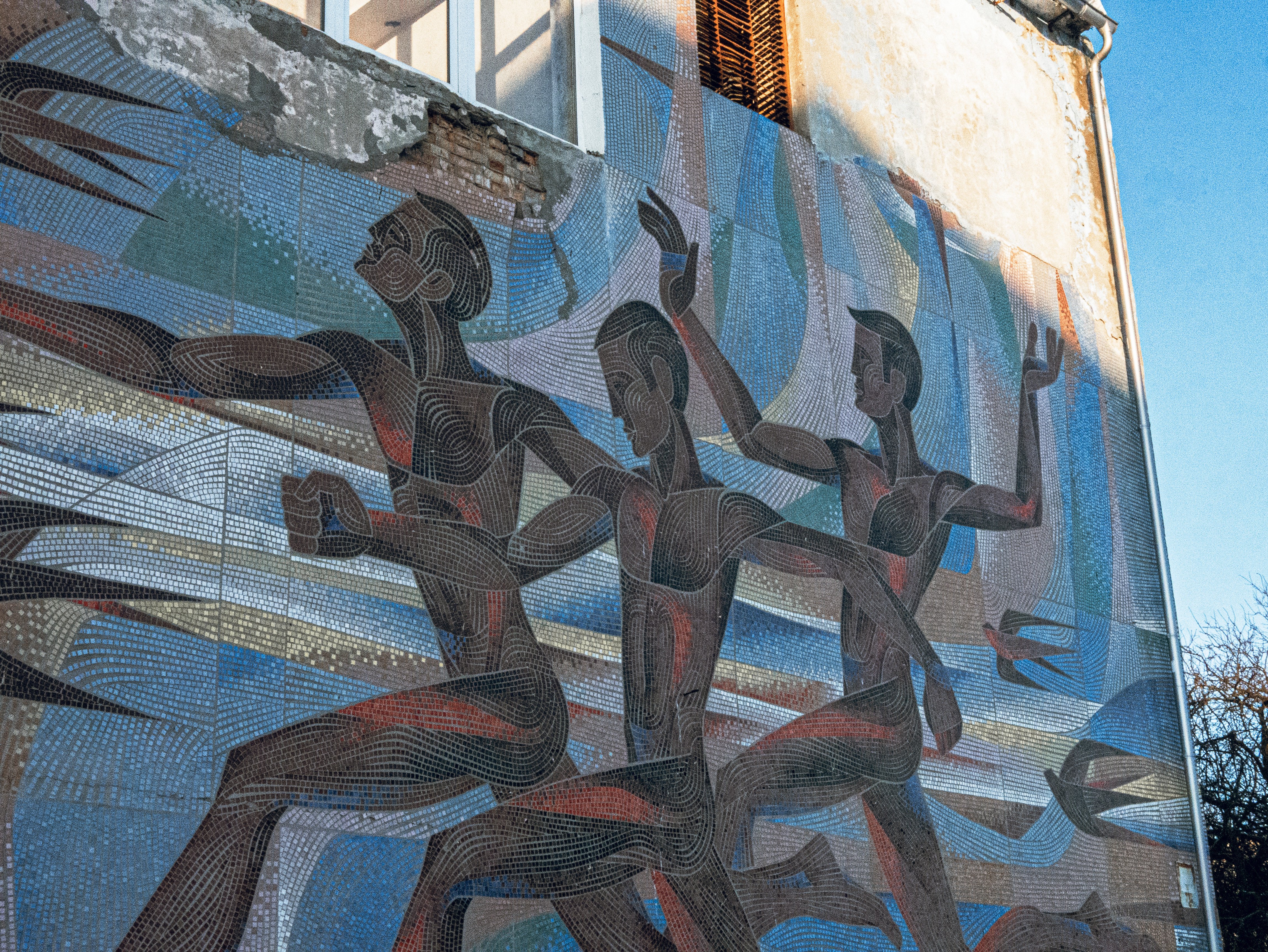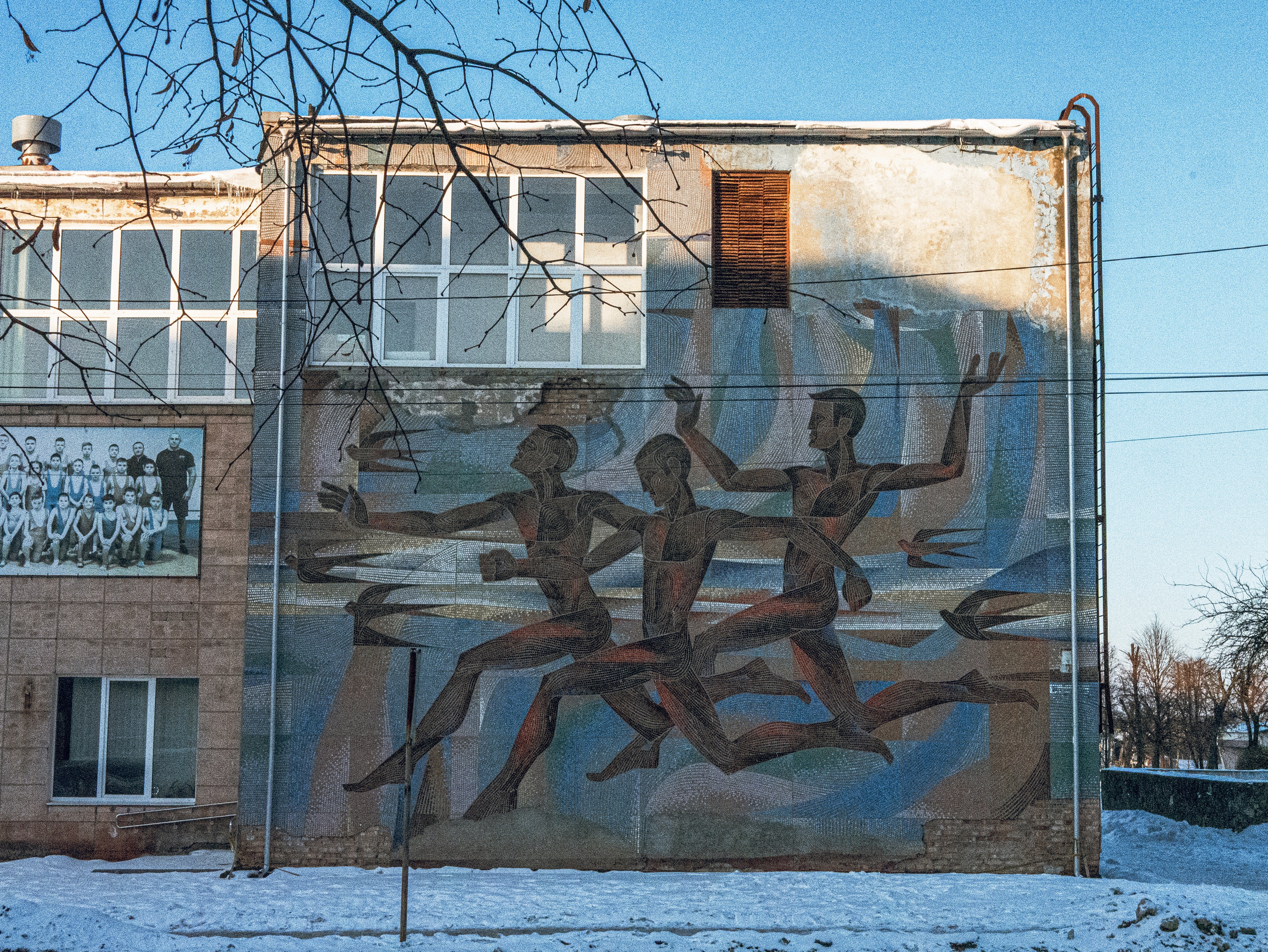 Панно вписане у навколишній простір — разом з атлетами зі стіни бігають діти. У вікнах будівлі з мозаїкою видно, як тренуються юні спортсмени, а через дорогу — стадіон, де грають у футбол.