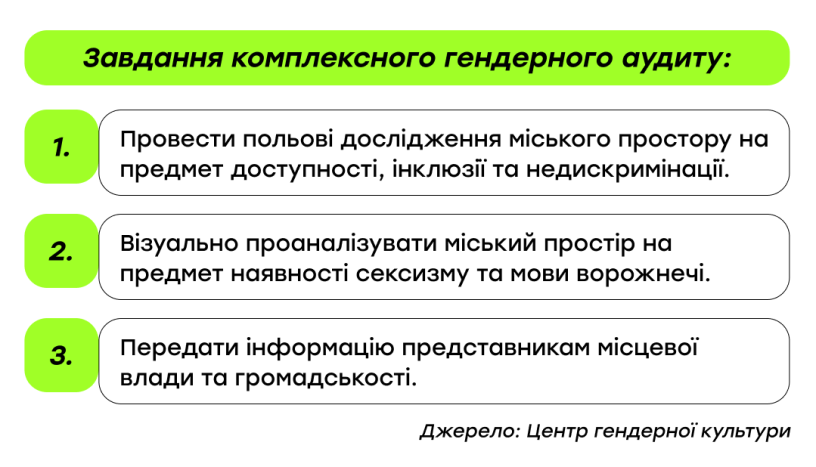 Методик проведення комплексного гендерного аудиту міського простору є декілька. Ознайомитися з однією з них можна у посібнику, розробленому Центром гендерної культури, за посиланням.