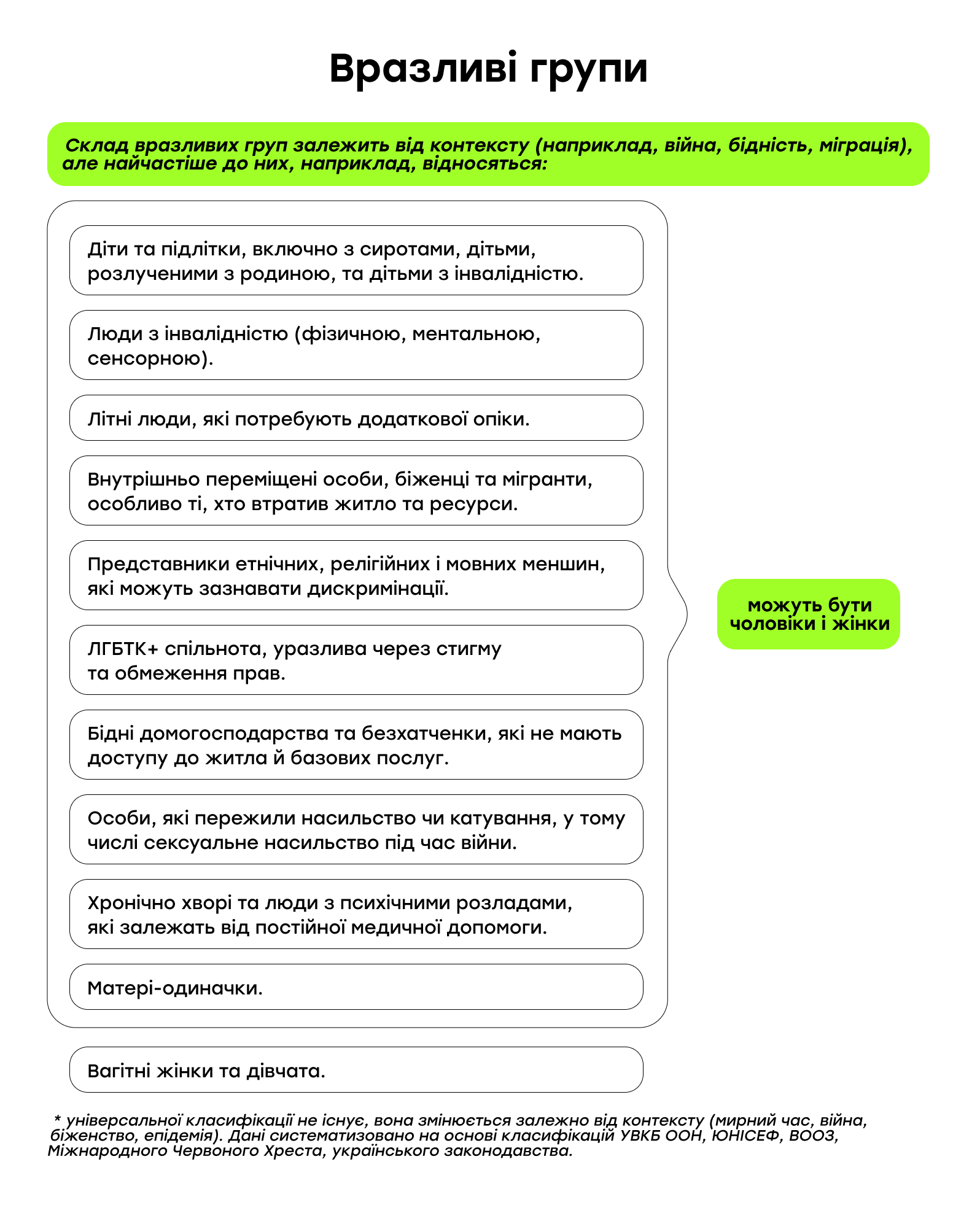 Розглядаючи питання безпеки, зазвичай акцентують на вразливих групах населення. Це люди, які найбільше ризикують зазнати насильства, дискримінації, втрати доступу до базових прав і послуг або не мати достатнього захисту в кризових ситуаціях.