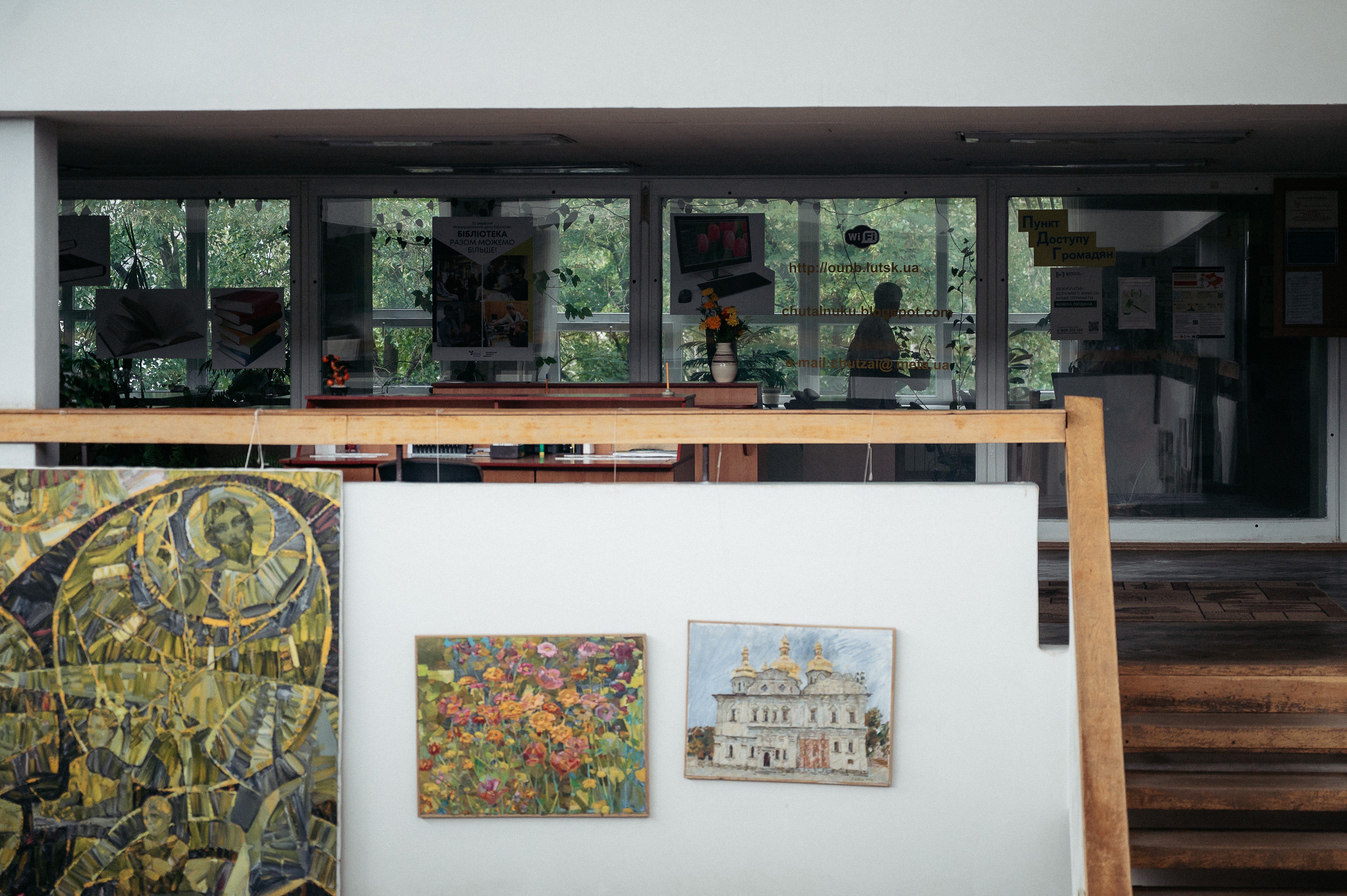 Бібліотека давно перестала бути трьома поверхами тиші, в якій шарудять сторінками читачі. Тепер у кожному кутку — рух. На першому поверсі працює художня виставка та плетуться сітки, раз на місяць приїздять працівники БФ «ЯМаріуполь» допомогти землякам з реєстрацією, виплатами, видати сухпайки.