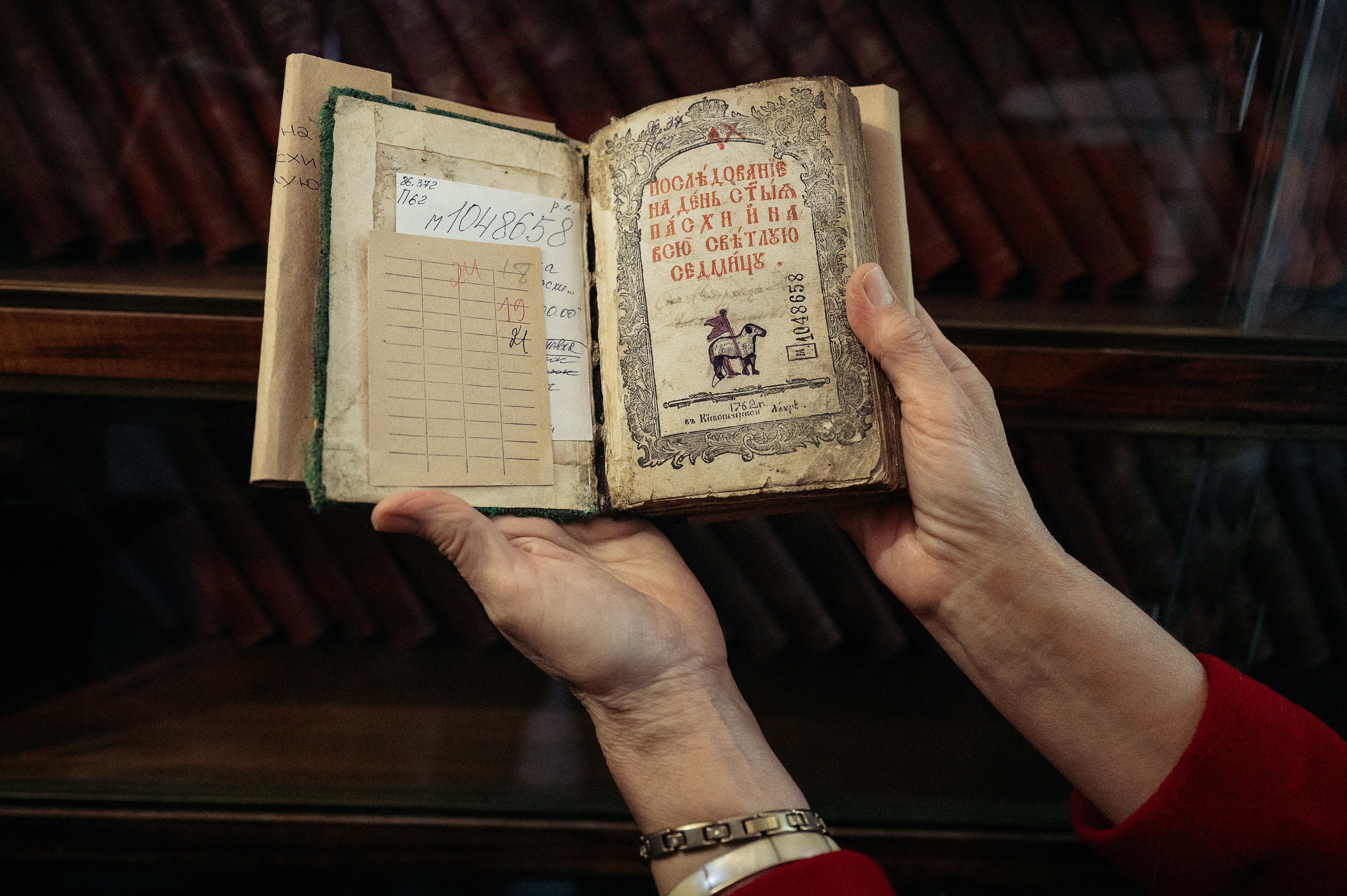 Тоненька, обшита шкірою, датована 1795 роком. Це один із найдавніших фоліантів про походження язичницьких богів. Обкладинка дбайливо загорнута у крафтовий папір. Поруч — Великодній молитовник 1762 року. Про такі книги кажуть «намолені» — сторінки в плямах й позначках, а на затертій обкладинці приклеєна маленька ікона у пластиковій рамці. Давні церковні написи важко піддаються розшифровці, але завідувачка відділу швидко й виразно читає рядок за рядком старослов’янською.