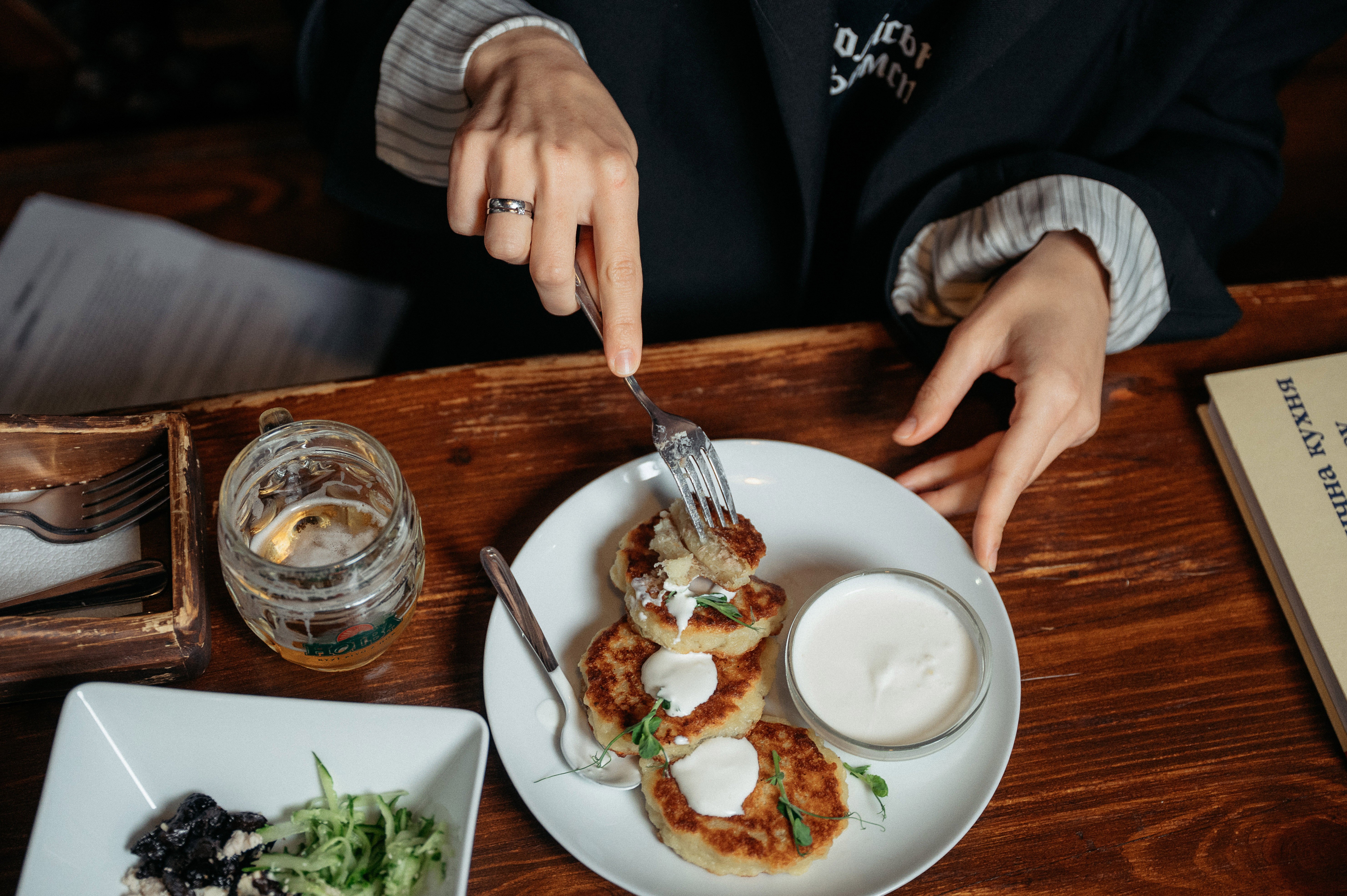 На столі вчасно з’являються деруни з м’ясом та сметаною, прикрашені мікрозеленню. Виринає наболіле запитання: