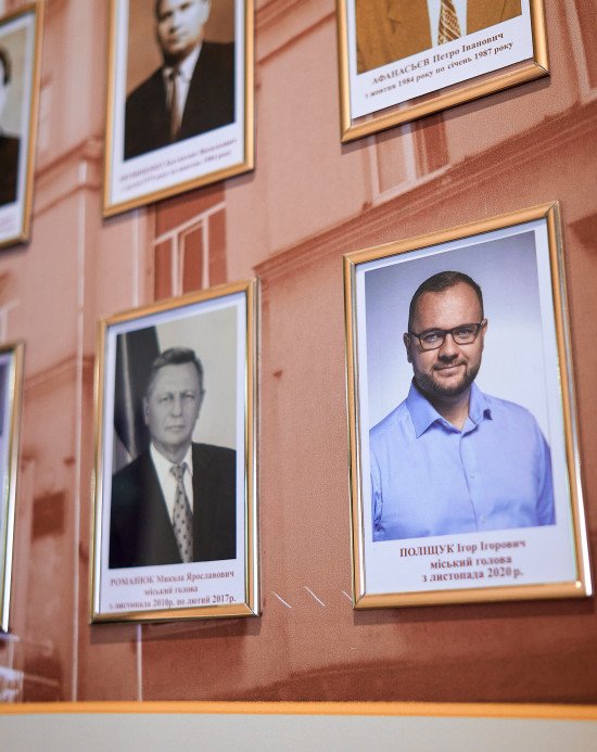 Біля кабінету ще міського голови Ігоря Поліщука періодично з’являються відвідувачі, самого Поліщука не видно. На стіні поруч висять портрети усіх мерів. За дивною традицією, колишніх тут зображують у чорно-білих відтінках. Чинних — у повному кольорі.