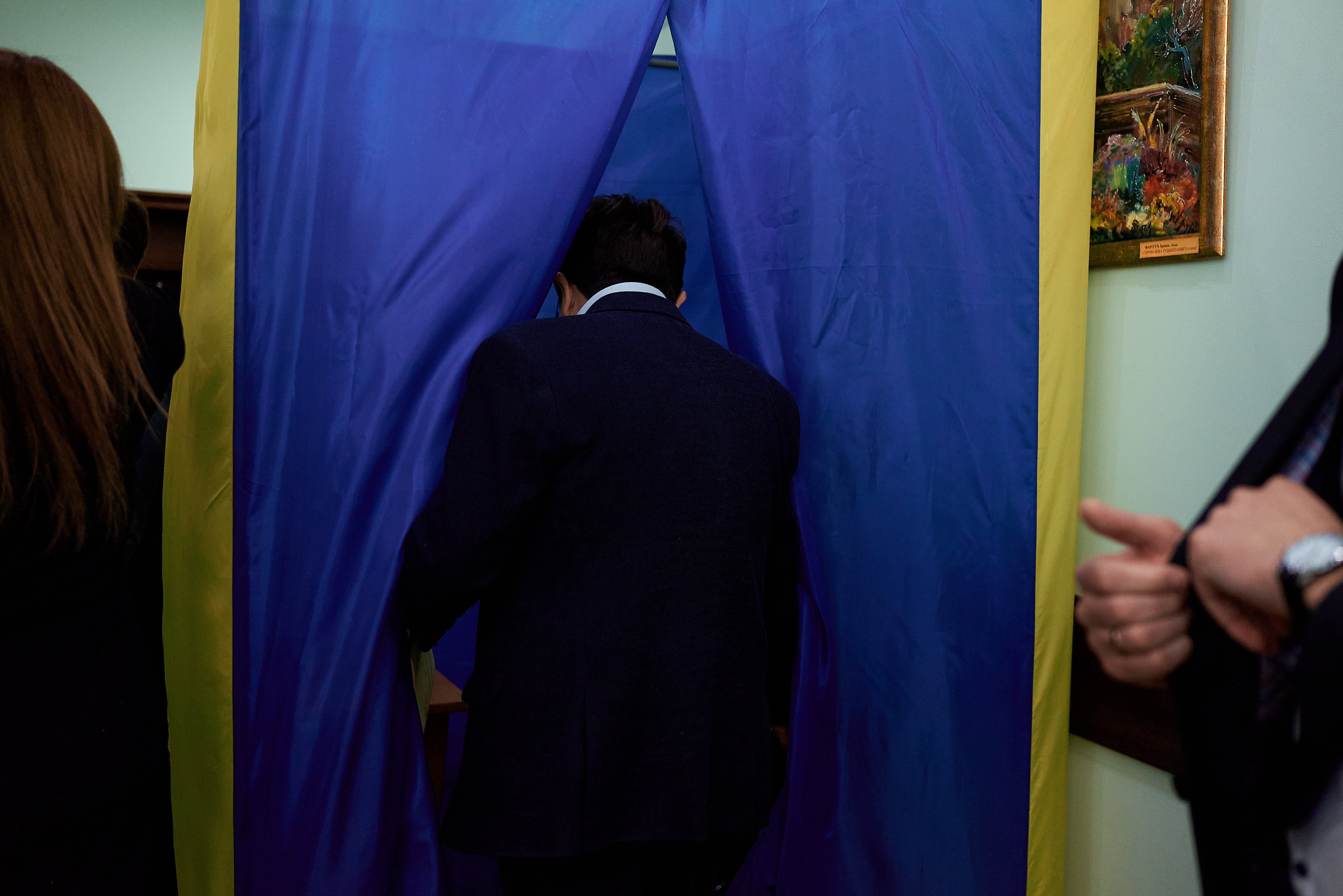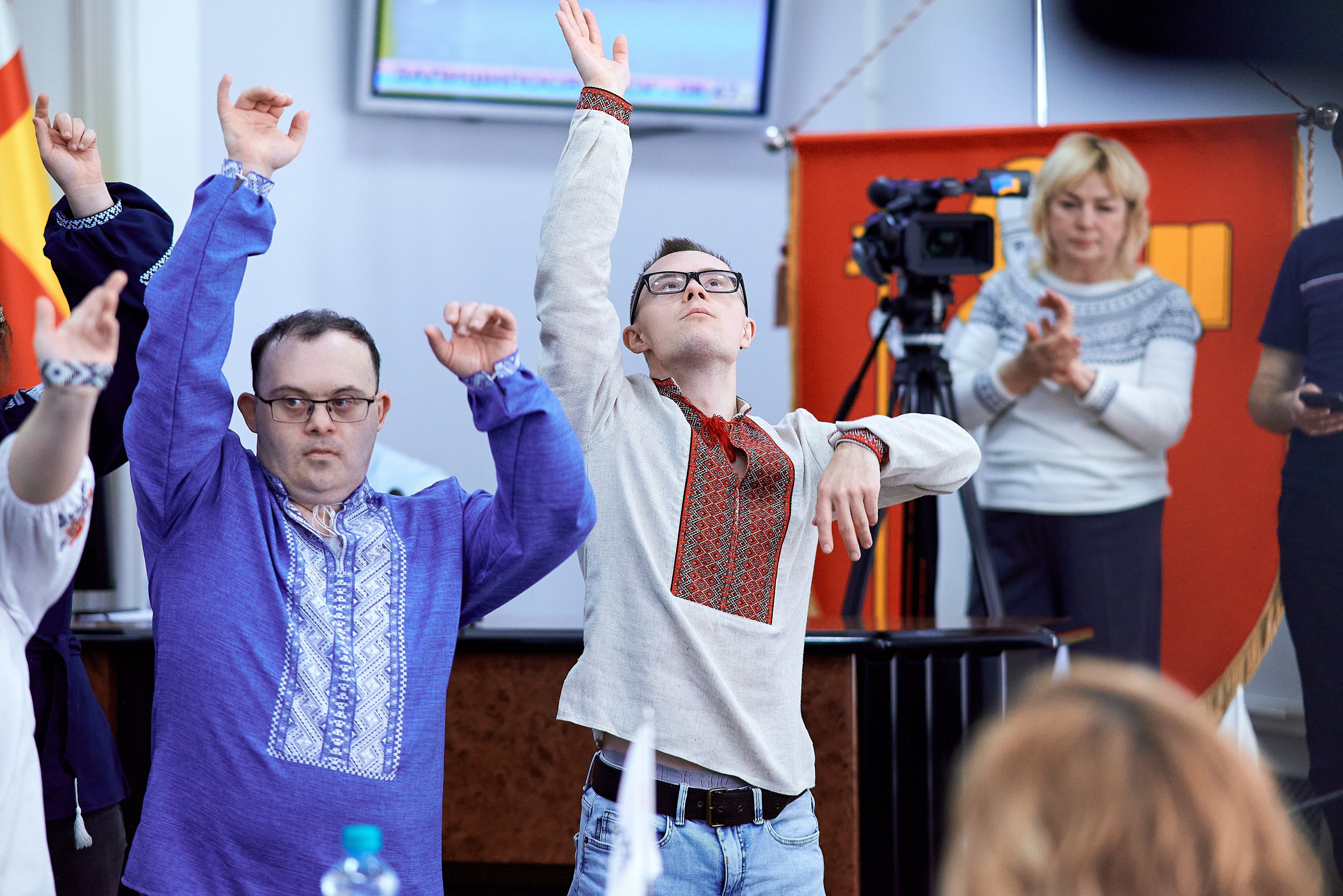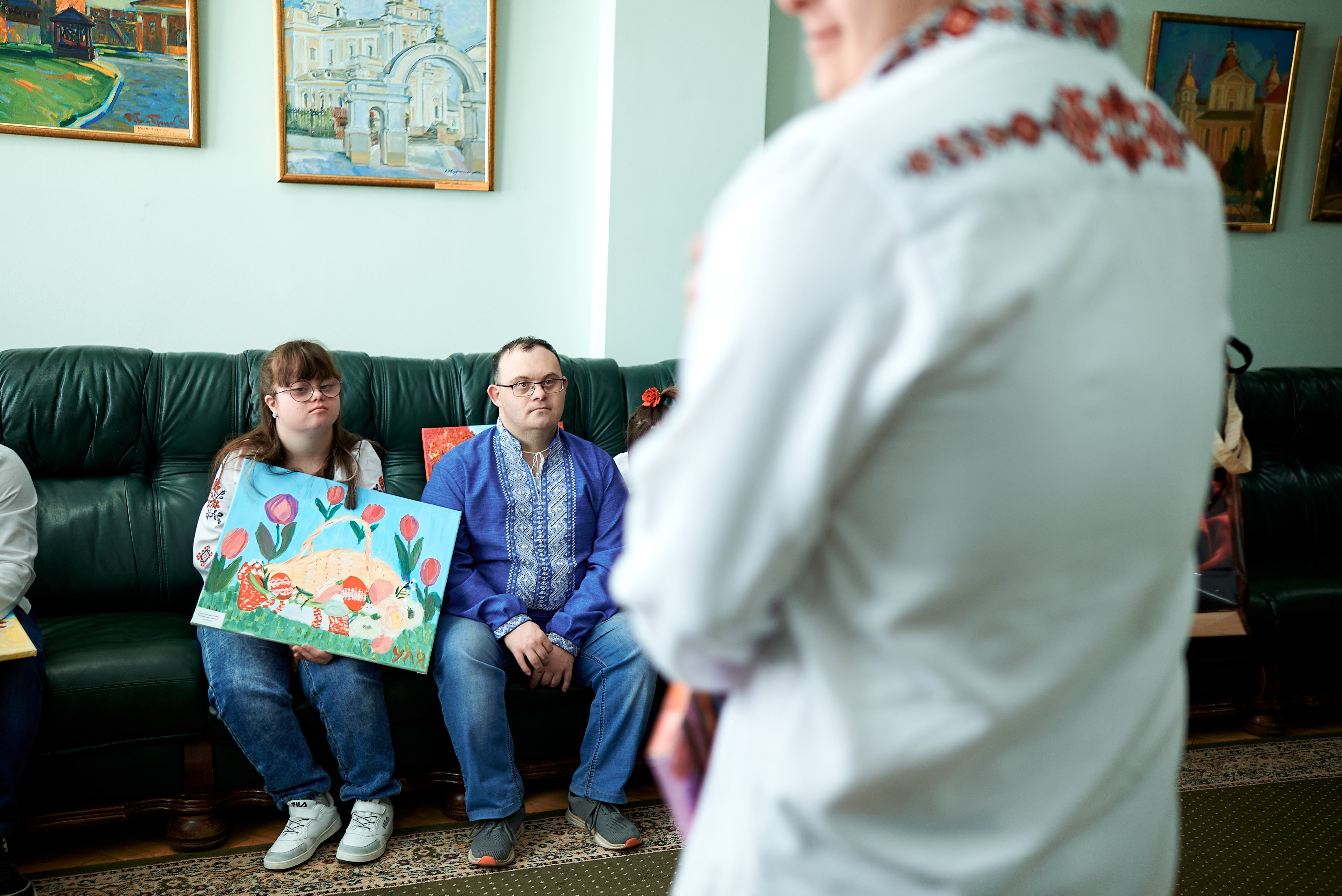 У холі вже домонтовують кабінку для голосування. Тут же ж на дивані у вишиваних сорочках учасники громадської організації «Даун синдром», які прийшли показати власні картини та продати шкарпетки в знак підтримки організації та дітей із синдромом. Діти щиро вітаються, повторюють рухи танцю, якими хочуть привітати місцевих обранців.