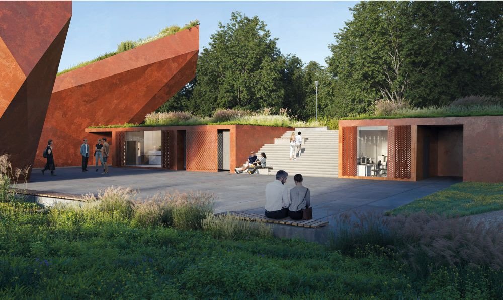 Колаж з візуалізації проєкту Меморіалу загиблих Героїв України у Львові, опублікованої на сайті міської ради Львова.