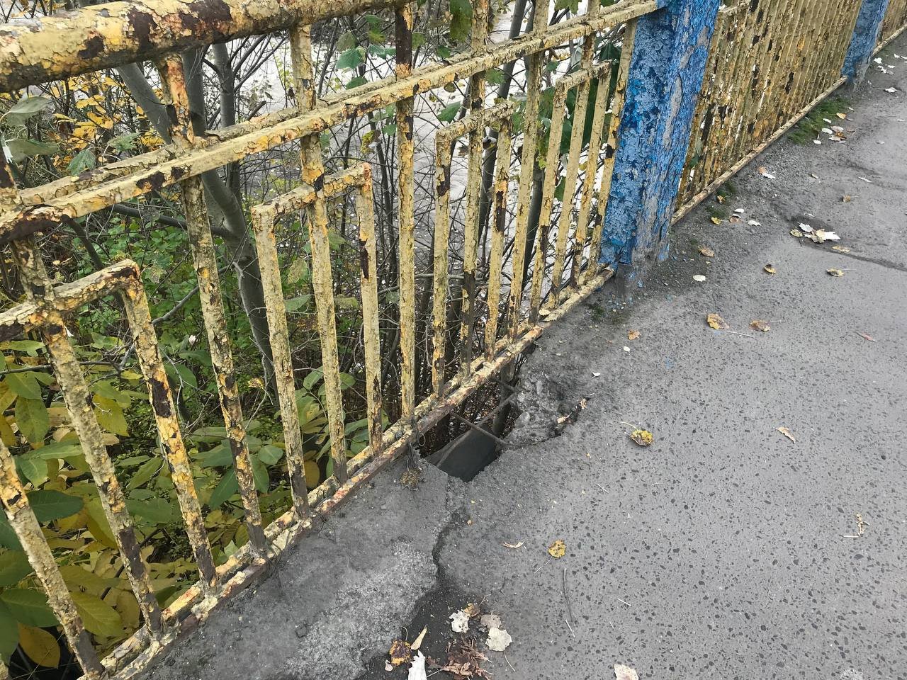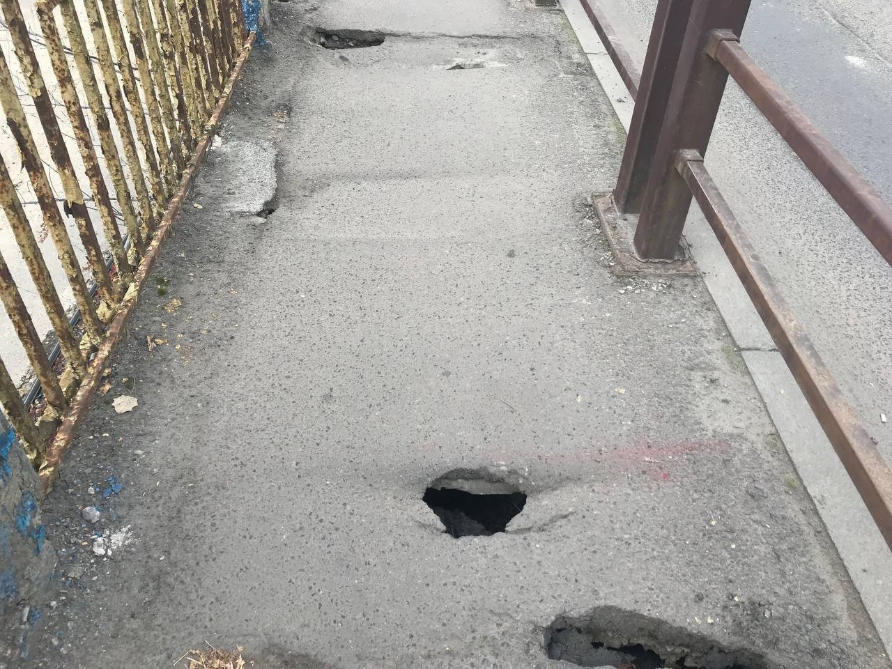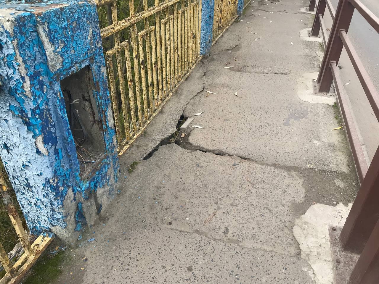 Міст давно потребує ремонту. Є ділянки, де на тротуарі утворилися тріщини і провалився асфальт. Також треба оновити фарбу на поручнях.