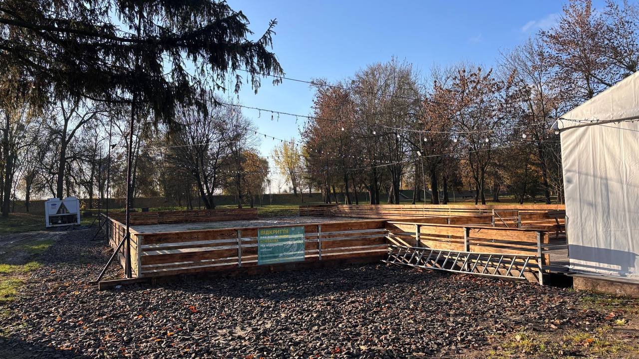 Льодову арену облаштовують поруч із атракціонами. Станом на 7 листопада тривають підготовчі роботи. Вже облаштували зону для переодягання, зробили борти для ковзанки, зараз займаються освітленням.
