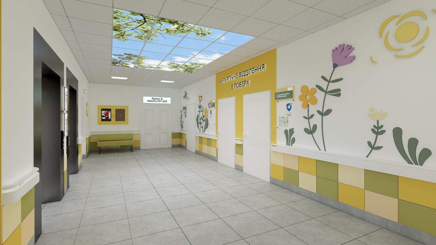У дизайні використали світлі кольори, тематичні зображення та додаткове освітлення, яке візуально розширює простір та робить стелю схожою на небо. Усе це має зменшувати тривожність і напруження, характерні для лікарняного середовища.