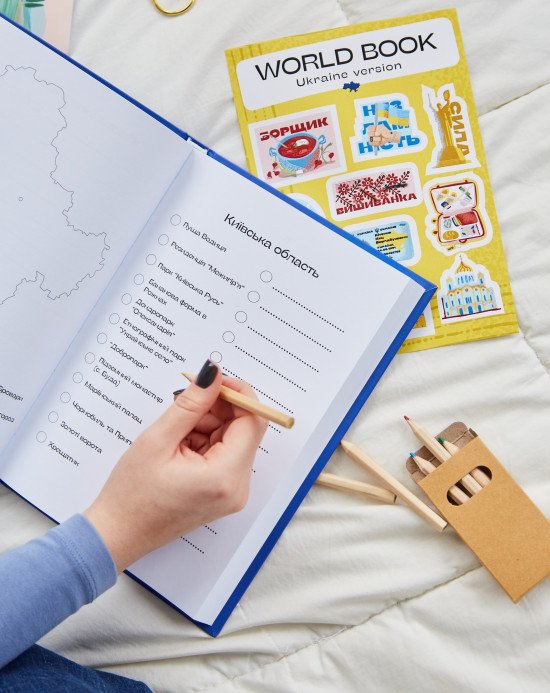 Усередині альбому — структуровані сторінки для країн і міст, місця для нотаток, фотографій, емоцій, дат, деталей, які зазвичай губляться з часом. Сюди можна вклеювати квитки на літак чи в музей, де ви побували, записувати свої враження, додавати фото тощо.
