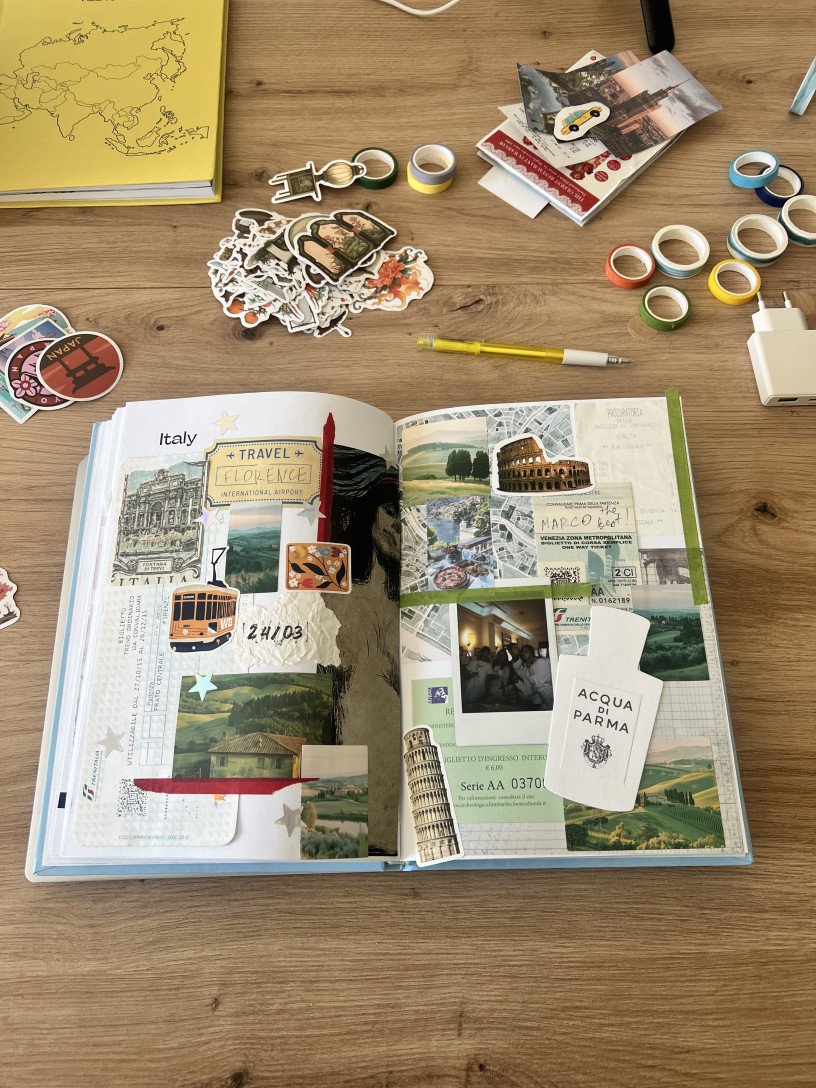 Повернувшись із подорожі до Греції, Настя відкрила коробку, куди роками складала квитки, листівки, буклети, і зрозуміла: знайти щось конкретне майже неможливо. Хотілося мати альбом, куди все це можна впорядковано вклеювати, а на українському ринку нічого схожого не було. Тоді вона вирішила, що зробить таку річ сама.