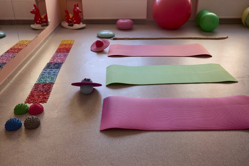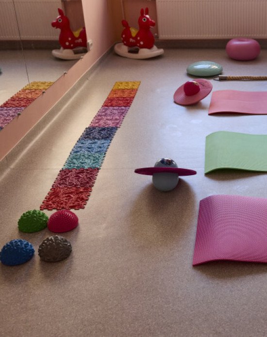 Зал фізичної терапії працює у реабілітаційному відділенні поліклініки. Просторе приміщення з високою стелею має хороше освітлення, вентиляцію та великі дзеркала, які допомагають контролювати правильність виконання вправ.