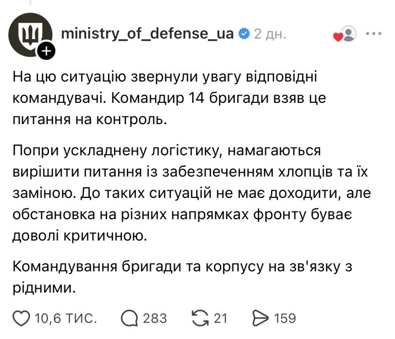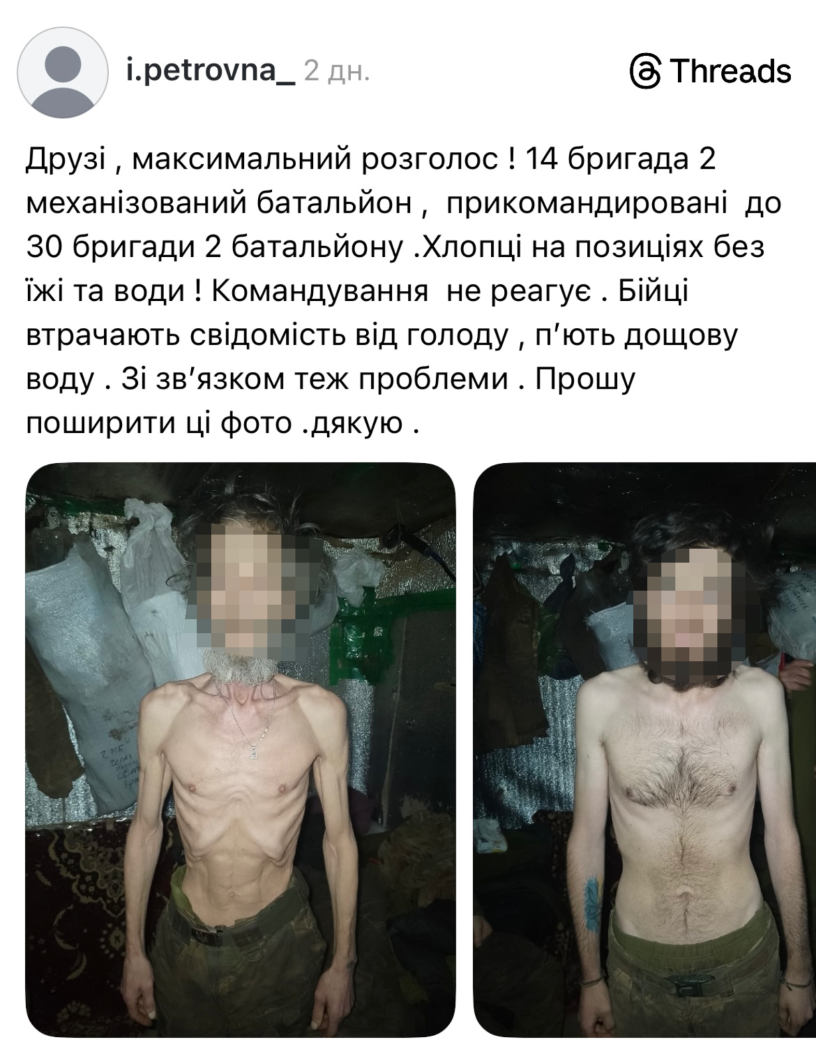 За кілька днів після того, як стало відомо про призначення нового командира бригади, у соцмережі Threads зʼявилась інформація про чотирьох військових одного з механізованих батальйонів 14 ОМБр. Користувачка під ніком i.petrovna_ опублікувала світлини бійців і повідомила, що вони перебувають на передовій у складних умовах — без достатньої кількості води та їжі.