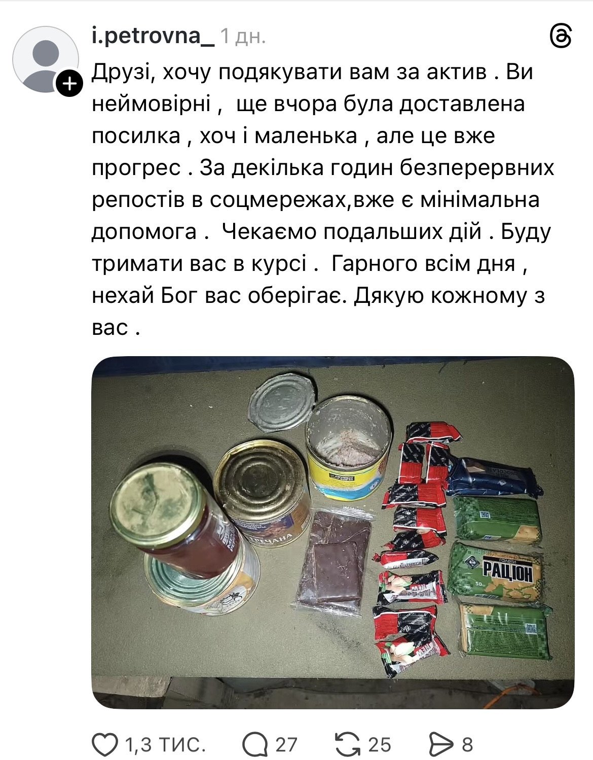 Попри складну логістику, провізію до військових вдалося доставити. Про це також повідомила авторка допису в Threads.