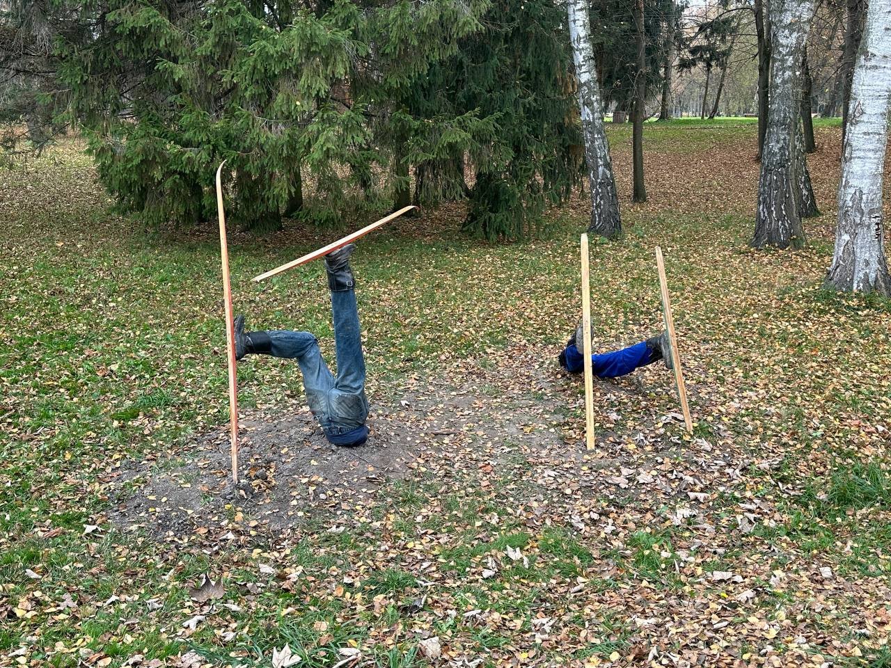 Одна з робіт — лижник, який впав догори ногами і з-під землі «стирчать» лише частина тулуба, лижі та палиці.