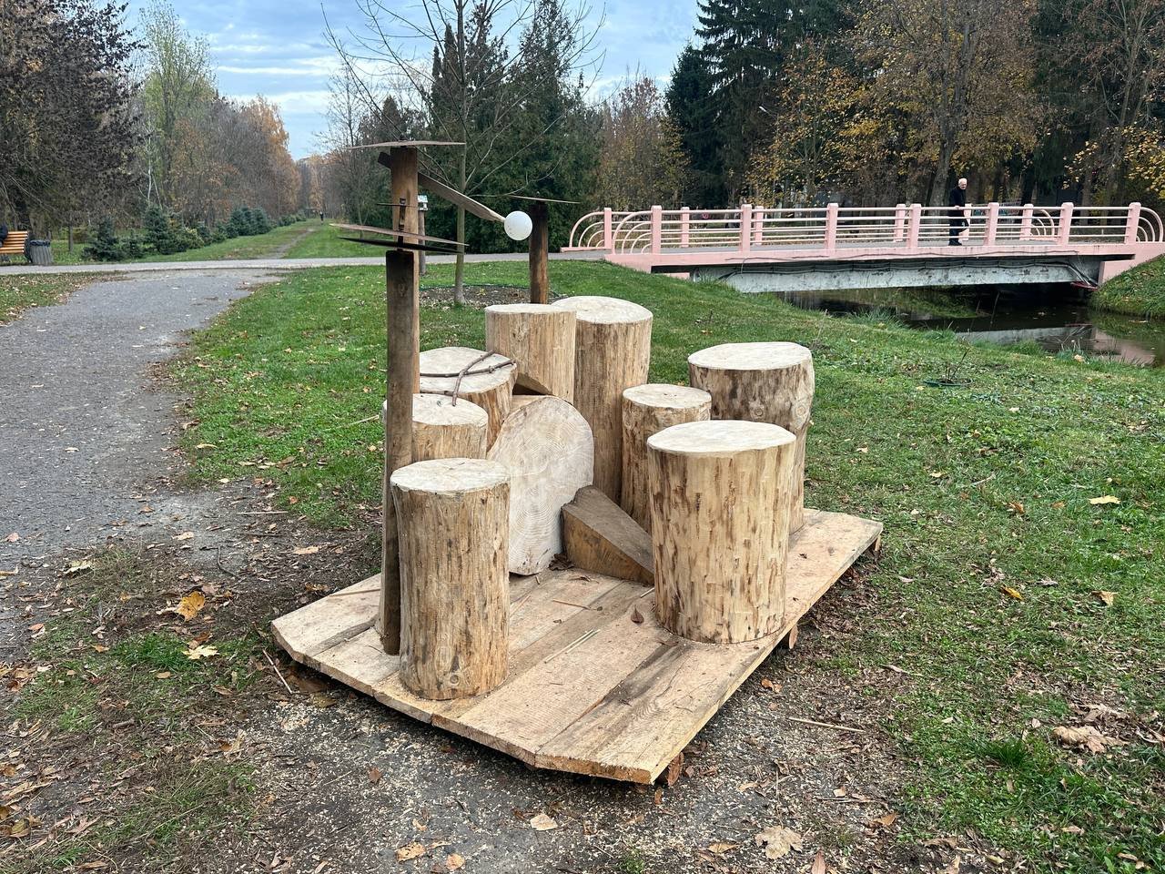 Поруч встановили дерев’яні барабани, зроблені з залишків деревини. На інсталяцію можна присісти й спробувати «пограти» на інструменті.