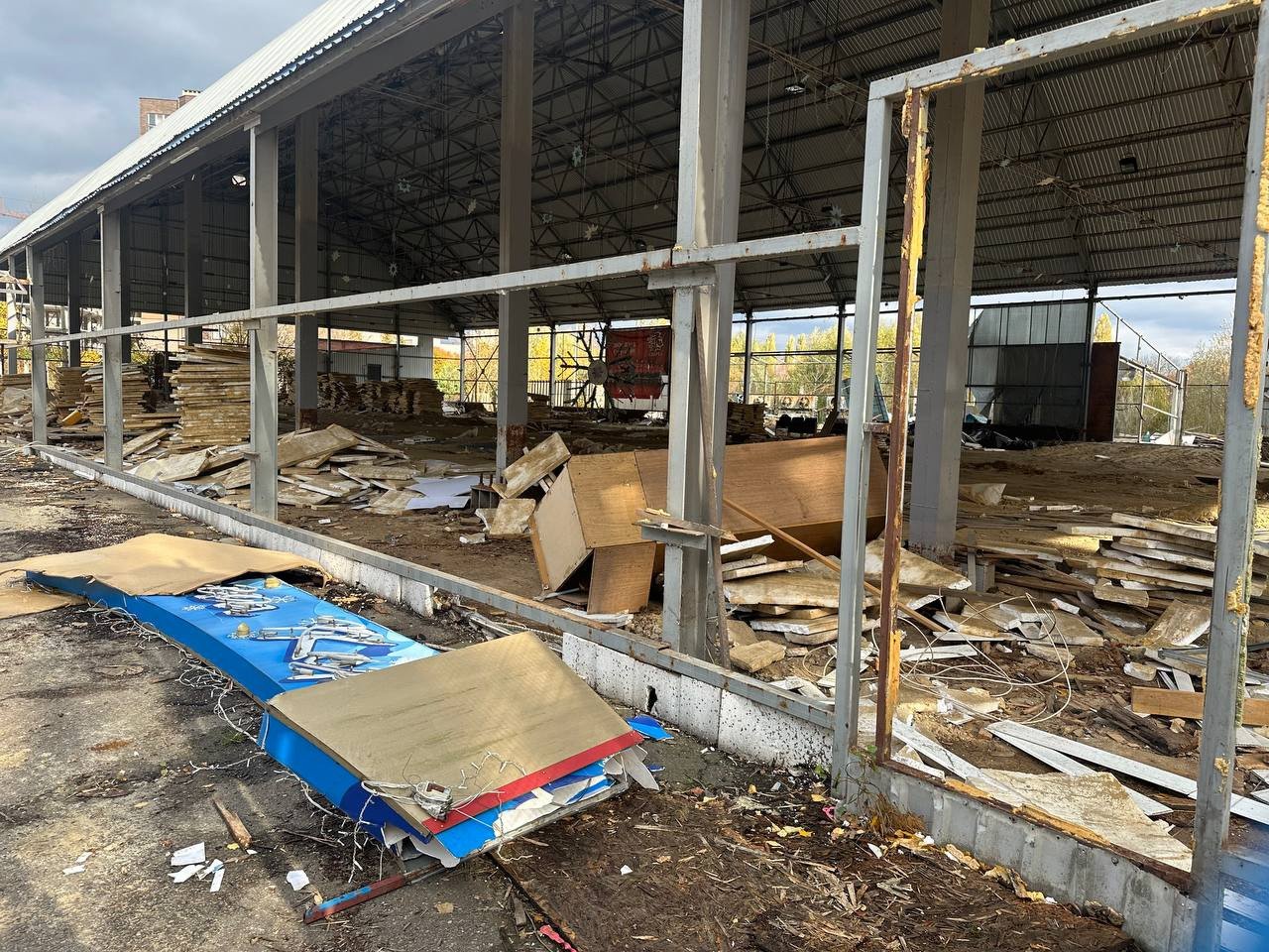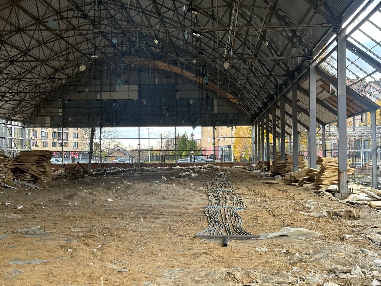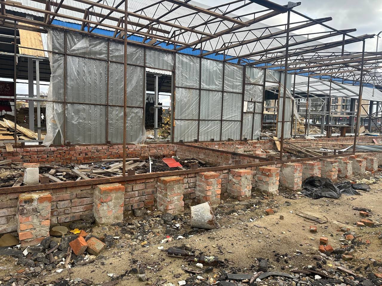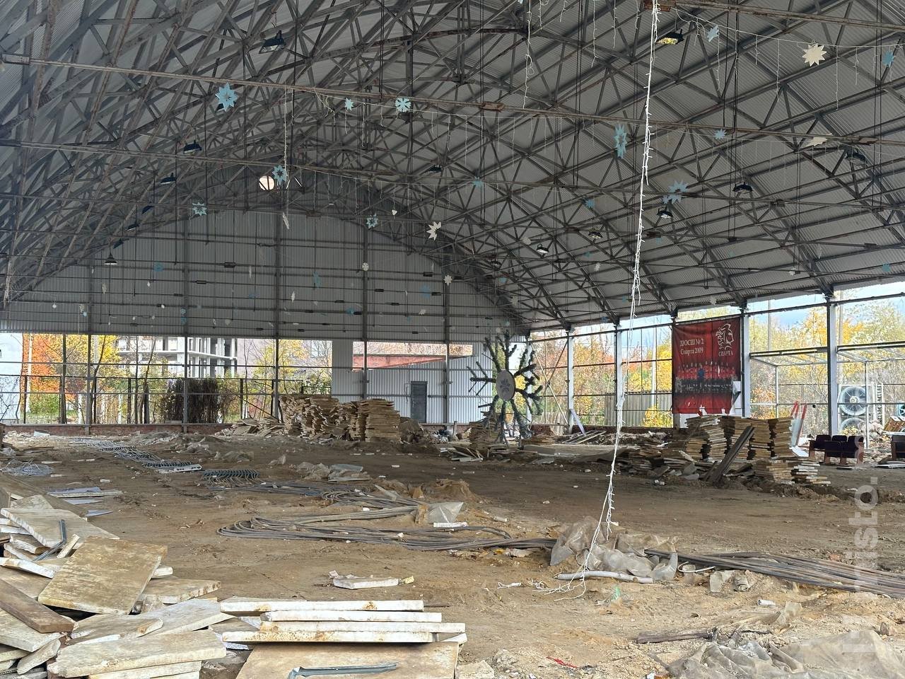Наразі від споруди залишився металевий каркас, на ділянці ще чимало будівельного сміття та розкидані декорації.