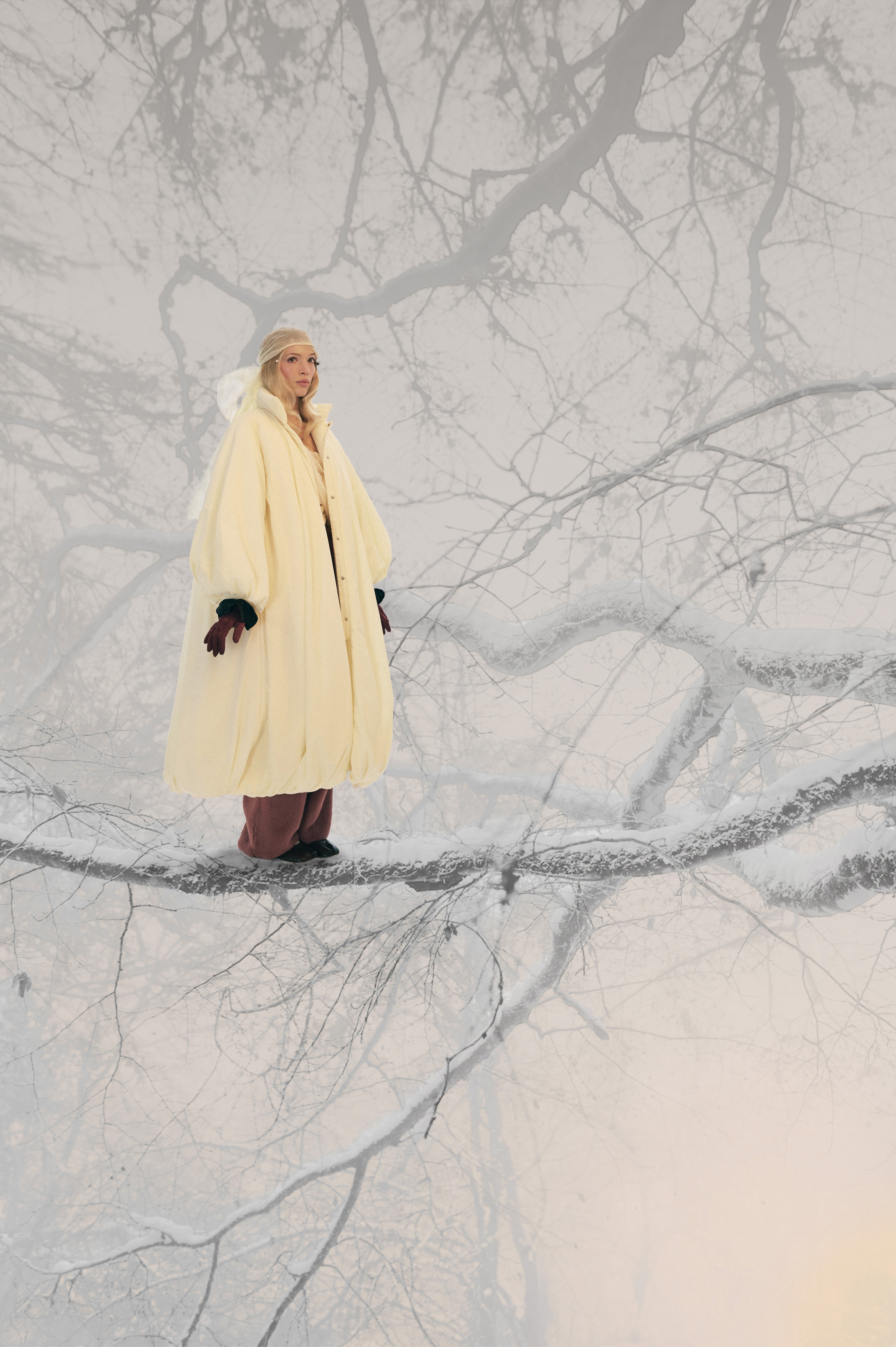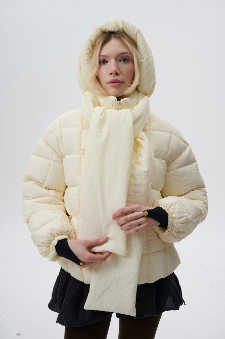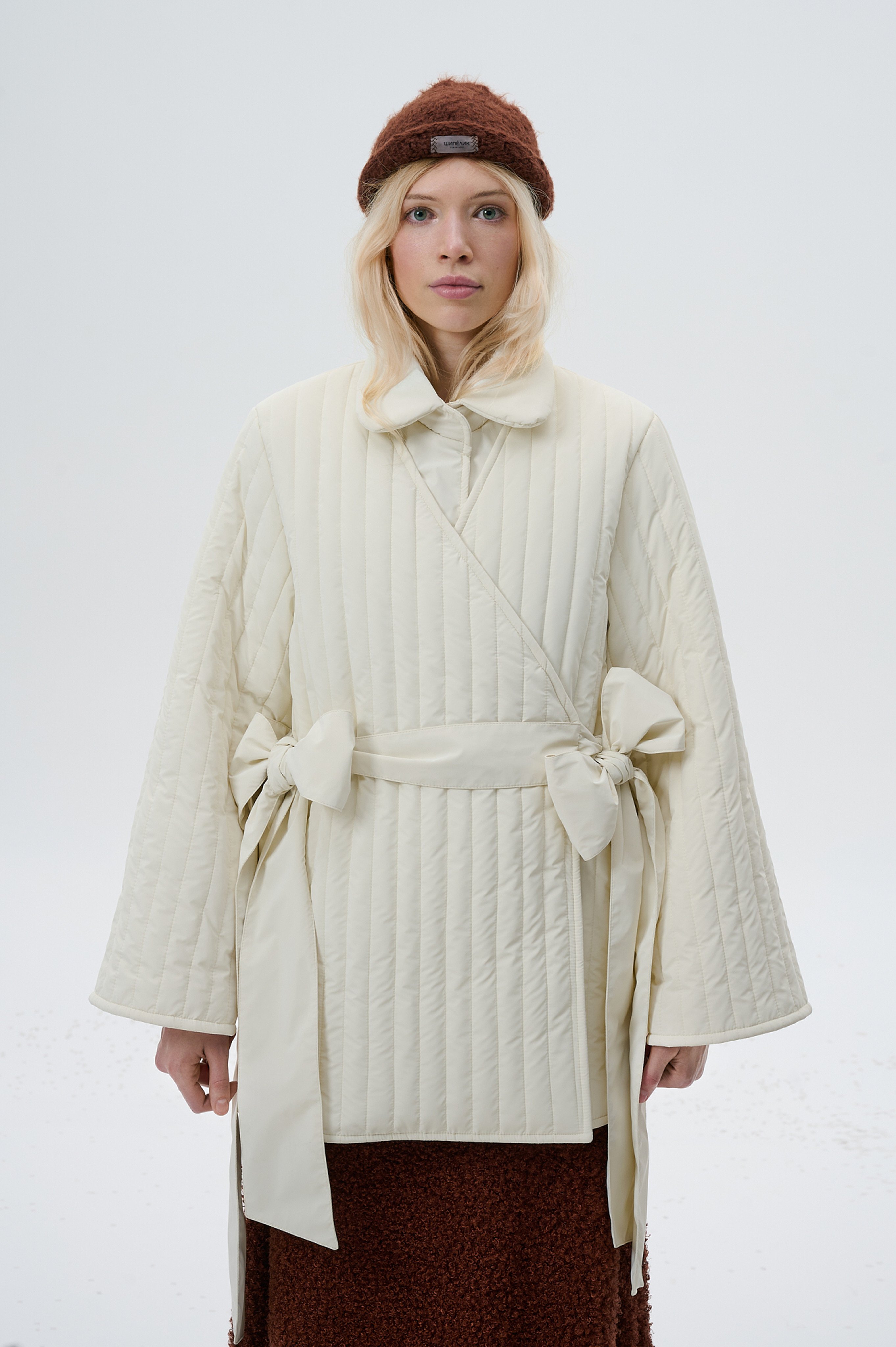 Пуховик-кокон у вершковому кольорі. Вбрання оздоблене обʼємними формами, декоративним стьобанням у формі бантиків на підкладці та широким довгим поясом-шарфом.